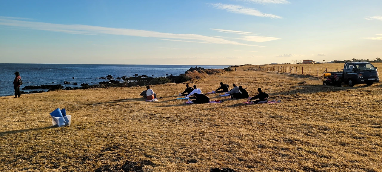 예전에는 ’신천마장’이라 불리는 마을 공동 말 방목장이었는데, 지금은 사유지다. 날씨가 추워지자 방목하던 소는 축사로 들어가고 초원에는 건초 뭉치만 보인다. 바다목장을 지나가던 올레꾼들이 모여 스트레칭을 하고 있다.