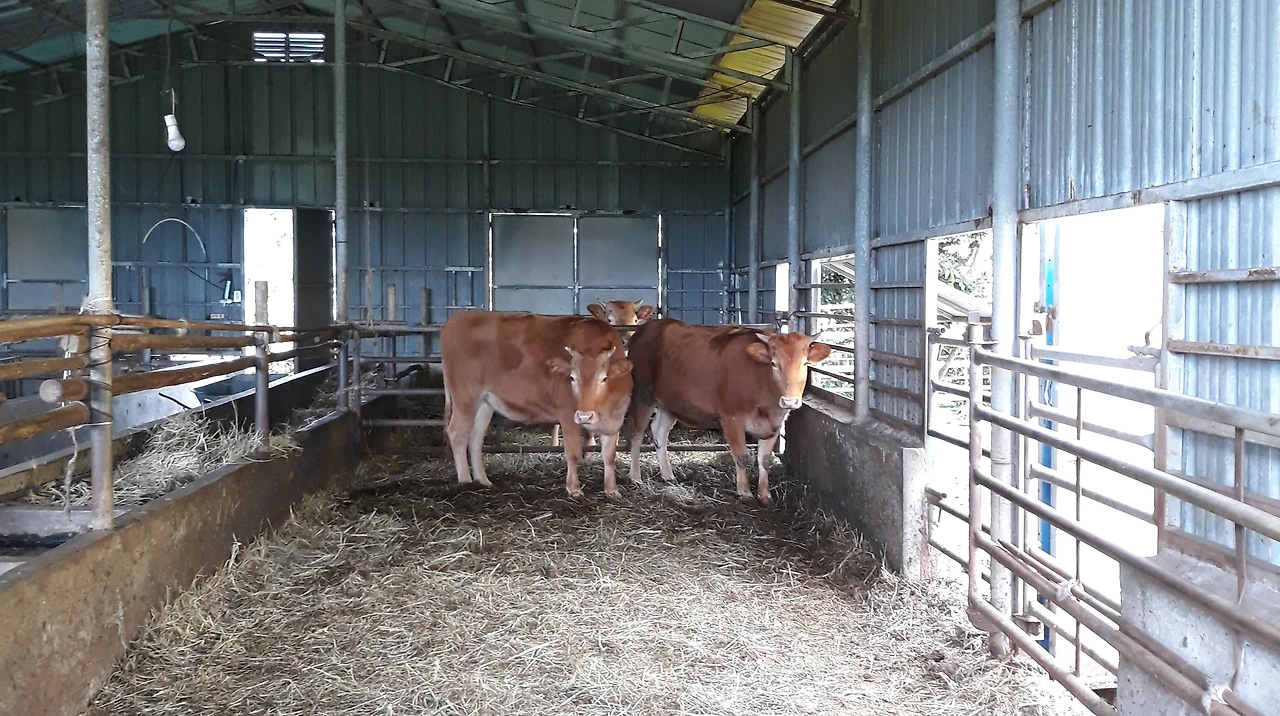 삼달로 버스 길가로 이어지던 올레는 엘리시움 펜션 앞에서 다시 농로로 들어선다. 차가 지나다닐 수 있는 넓은 밭담 길이다. 농가가 띄엄띄엄 보인다. 축사에서 노는 소를 보고 카메라를 들이댄다. 소의 눈이 왠지 긴장한 듯하다.