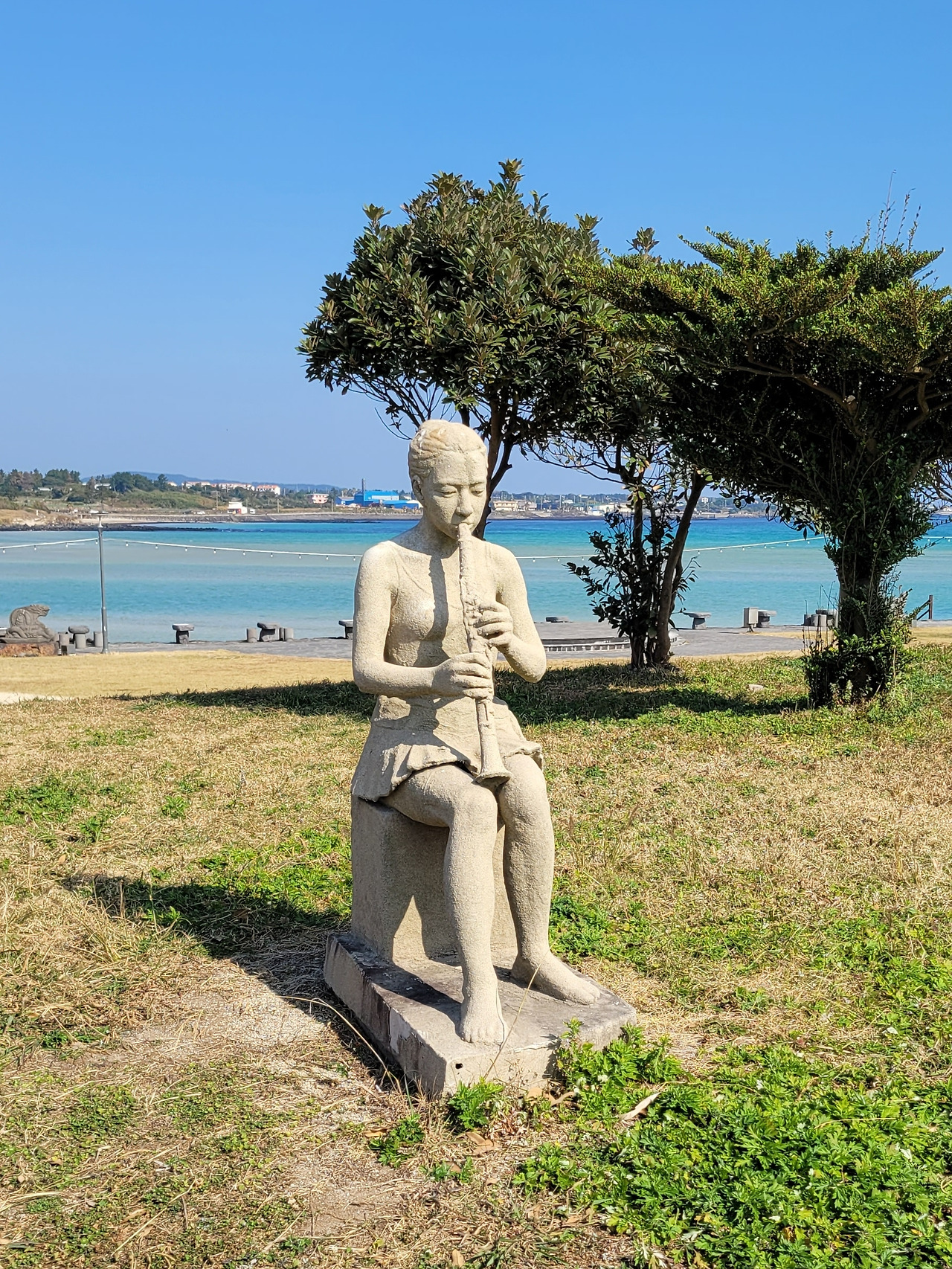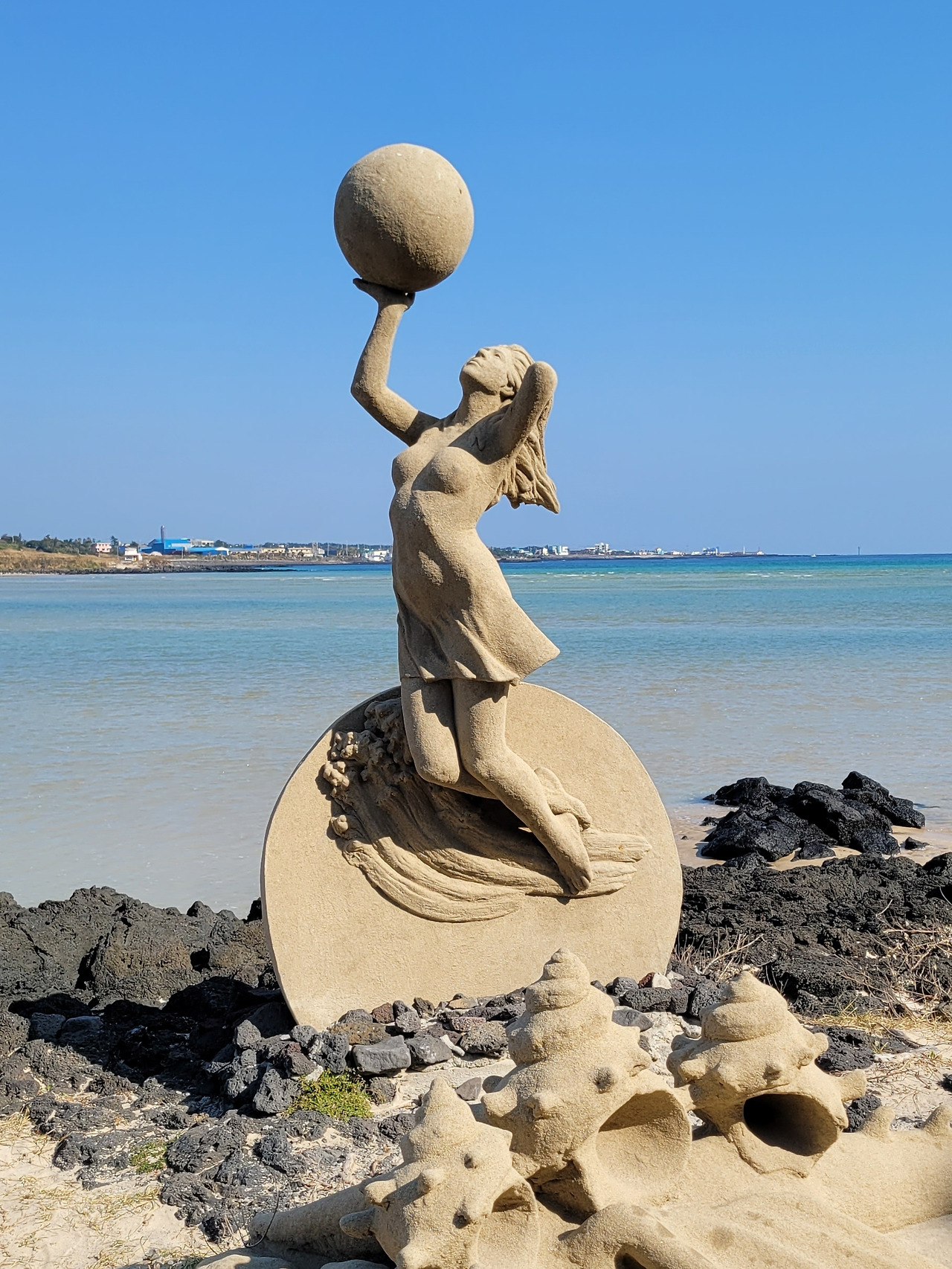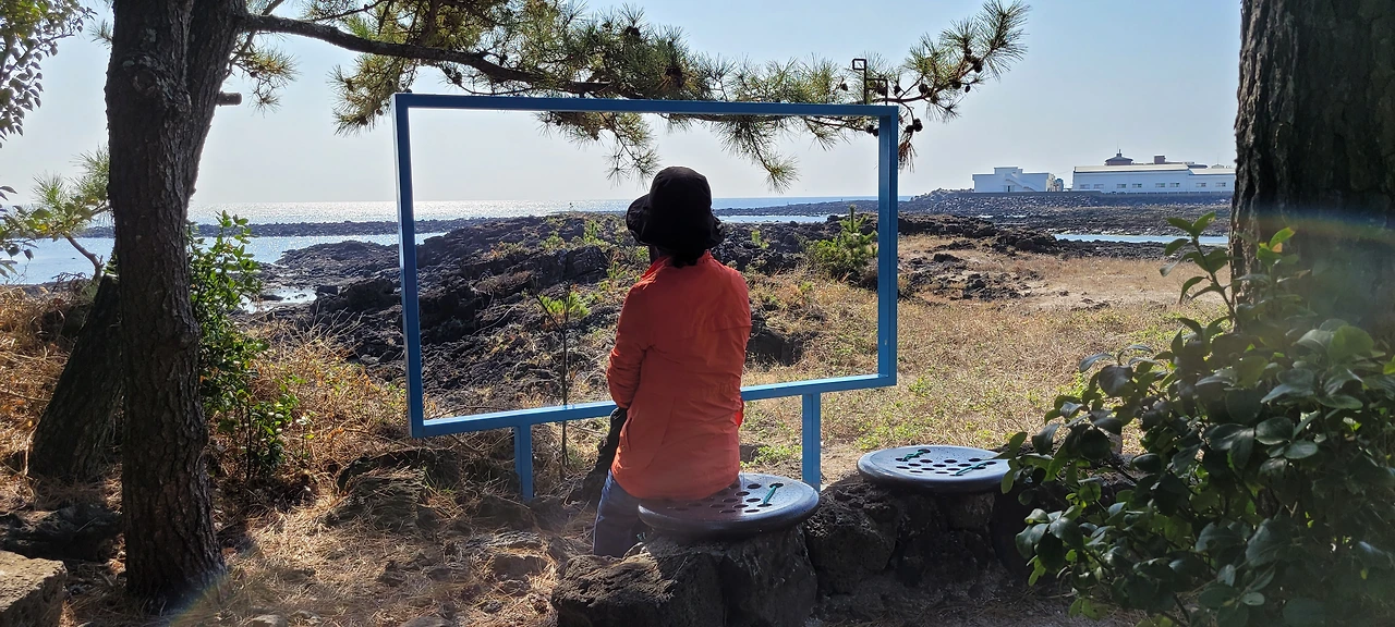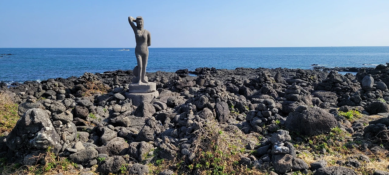 황무지의 거친 돌길에 해녀상이 서 있다. 힘들고 살기 힘들었던 시절, 테왁 하나에 의지하여 고달픈 삶을 꾸려 온 강인한 제주의 어머니, 누이가 내뿜는 정겨운 숨비소리가 들려오나. 호오이 호오 잇.