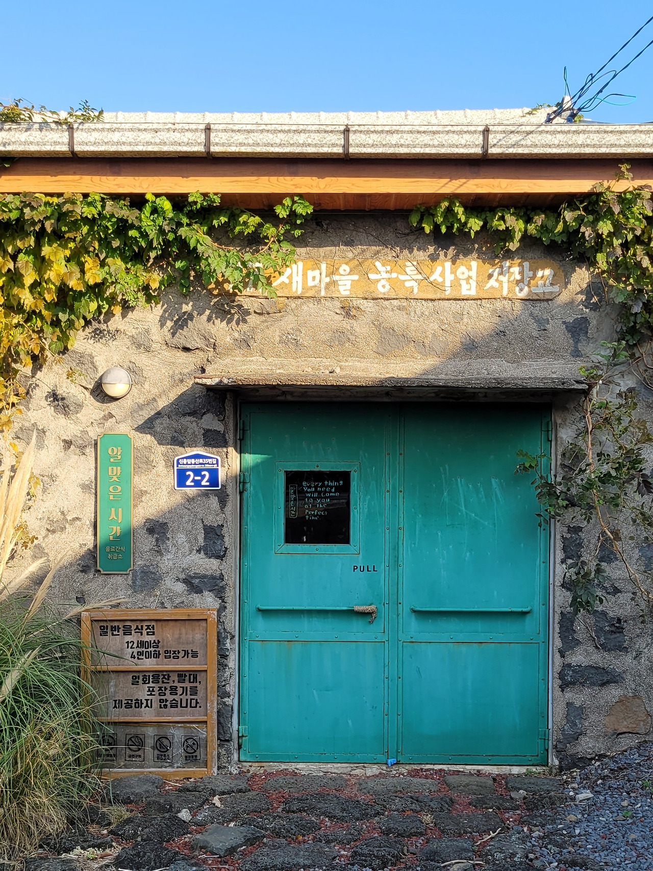 새마을 농특사업 저장고를 활용한 '알맞은 시간'이란 상호도 재미있다. '일반 음식점, 12세 이상 4인 이하 입장 가능'이란 알쏭달쏭한 안내문이 호기심을 자극한다. 영업을 하는지 알 수 없다. 문이 잠겼다.