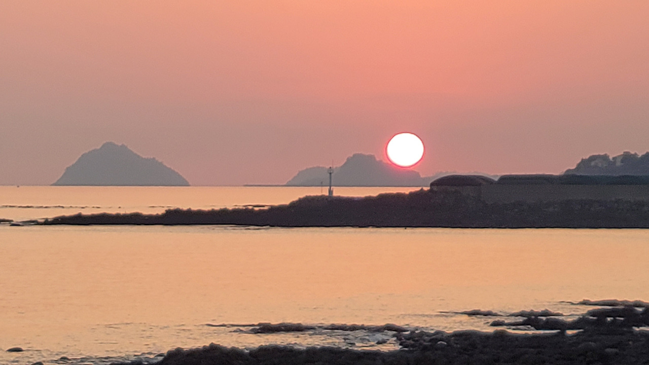 점점 어두워진다. 해 떨어지는 시간이 빨라지니 일몰을 보는 호사를 누린다. 벌포연대를 지나는데 문섬과 섶섬이 겹쳐 보이는 산허리에 떨어지는 해가 걸린다.