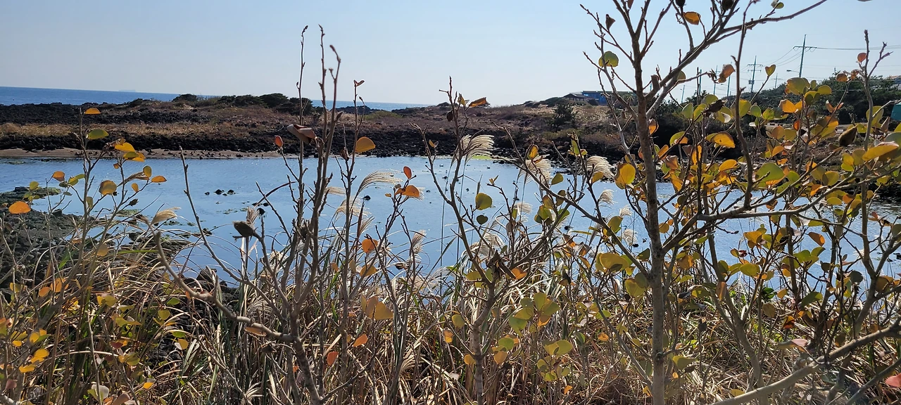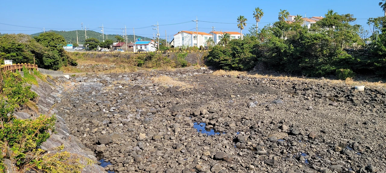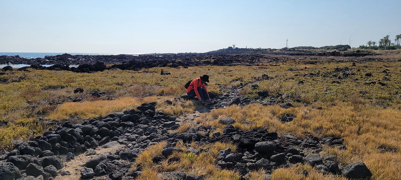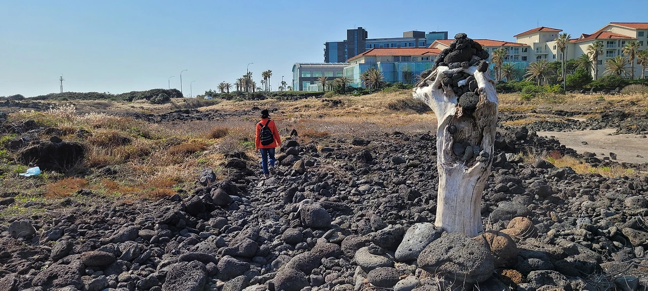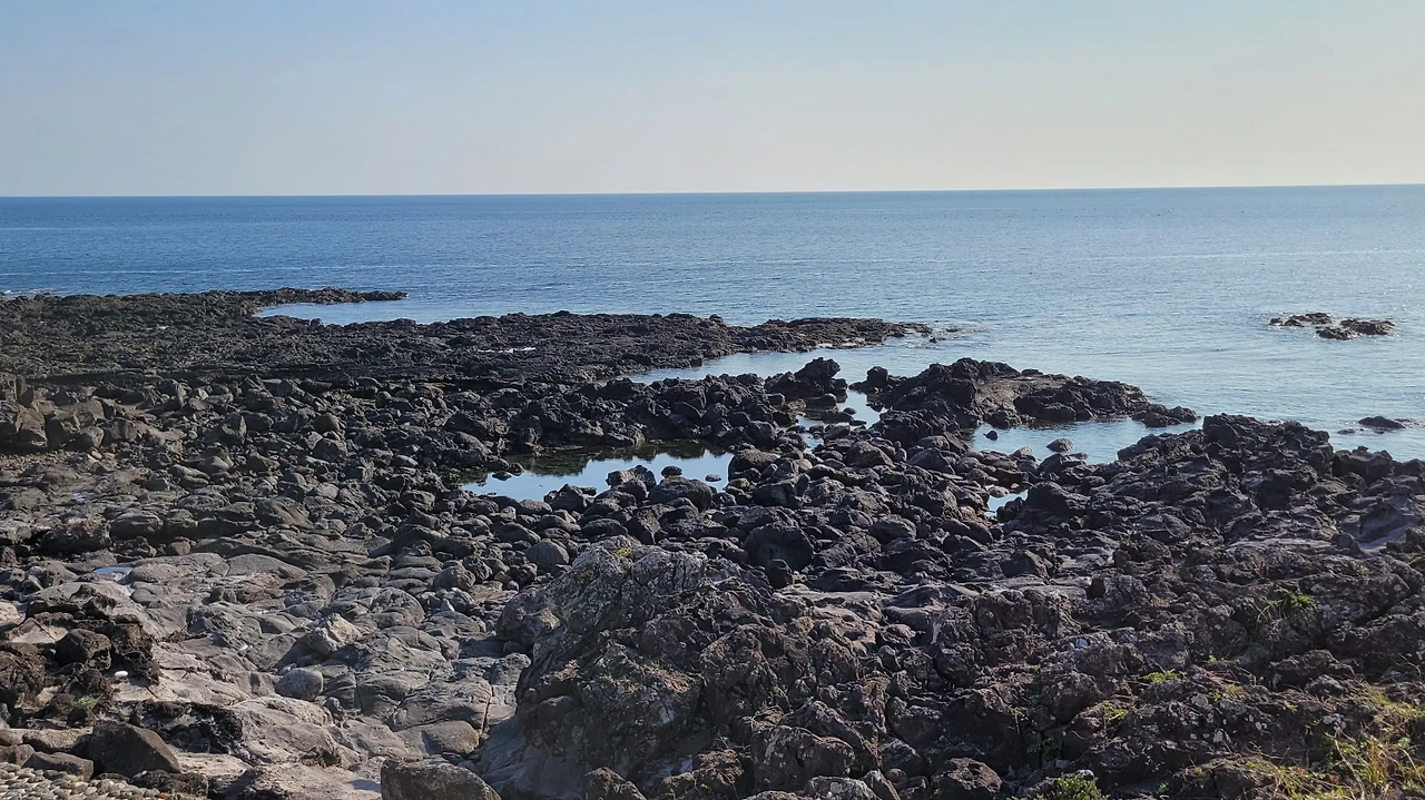 우회하는 돌길은 민속해안도로와 합쳐졌다 떨어졌다 하면서 나란히 간다. 화산 분출물이 쌓여 굳어진 화산 쇄설암이 해변을 뒤덮고 있다. 밀물 땐 물속에 잠겨있다가 썰물이 되면 검은 암석이 근육을 드러낸다.