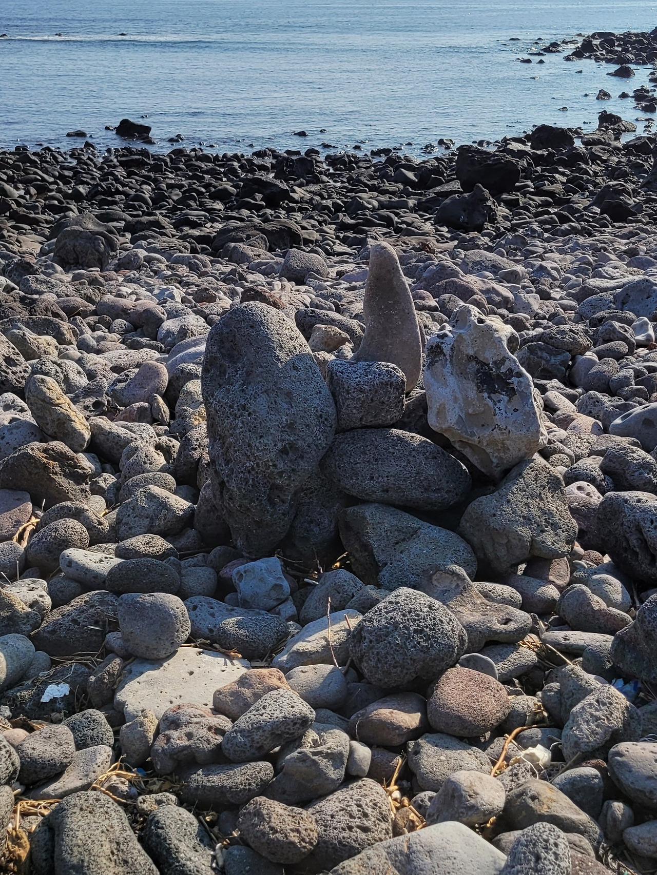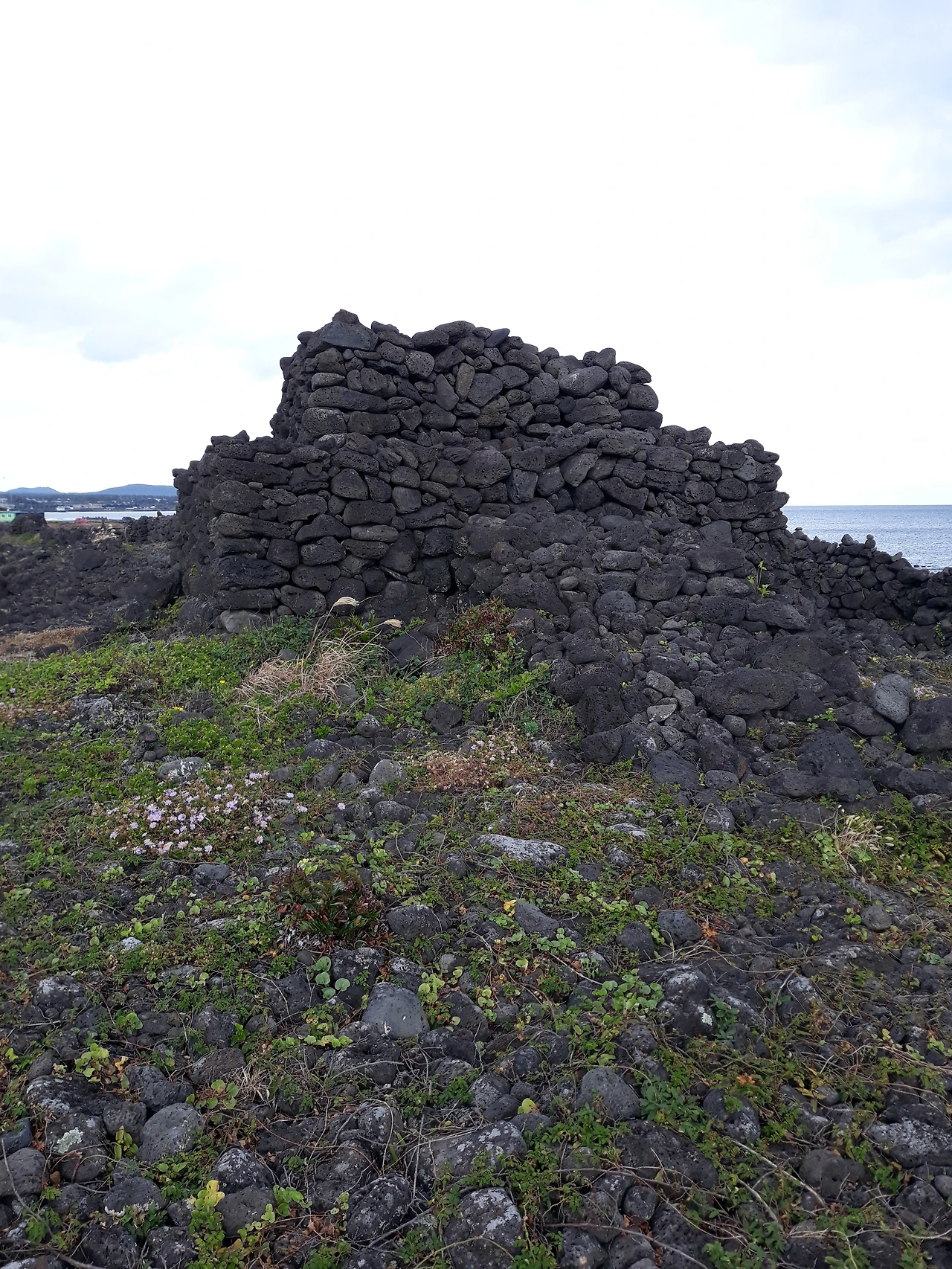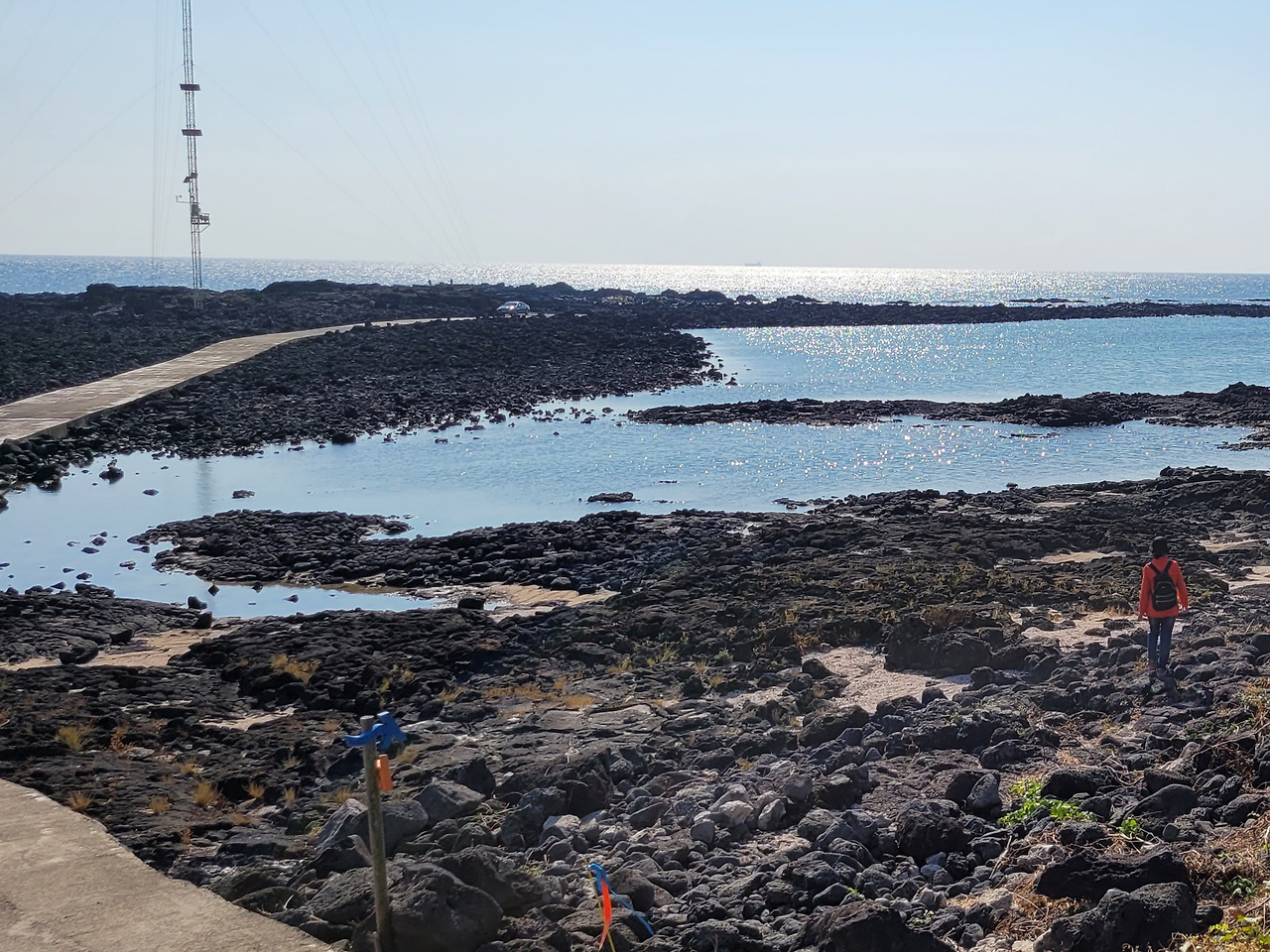 우회하는 돌길은 민속해안도로와 합쳐졌다 떨어졌다 하면서 나란히 간다. 화산 분출물이 쌓여 굳어진 화산 쇄설암이 해변을 뒤덮고 있다. 밀물 땐 물속에 잠겨있다가 썰물이 되면 검은 암석이 근육을 드러낸다.