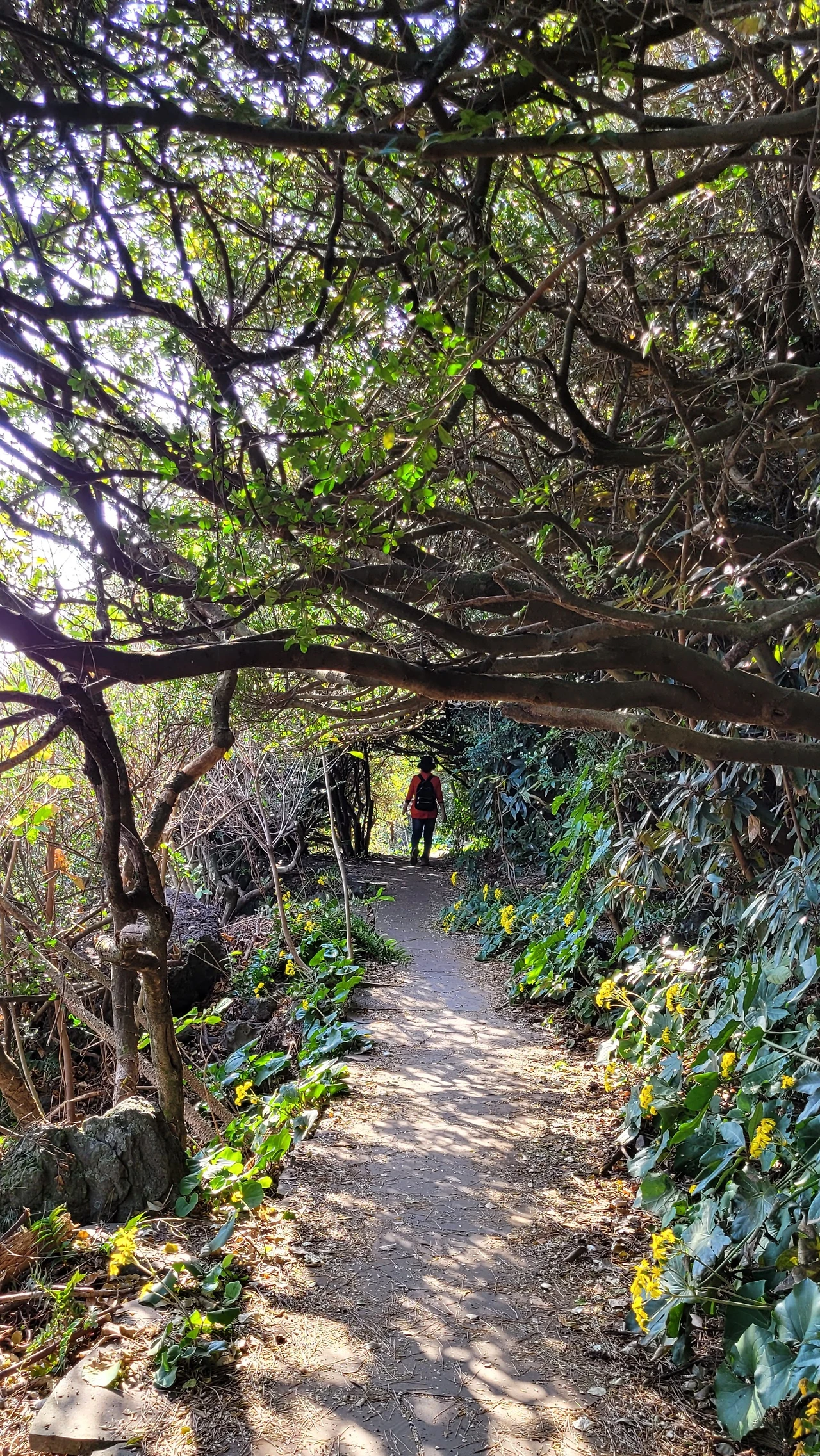 '소노캄제주'의 산책로를 지나간다. 다양한 상록 활엽 관목 밑으로 털머위가 노란 꽃을 피우고 있다. 공기 정화 능력이 뛰어난 팔손이 가 하얀 꽃 뭉치를 달고 있다.