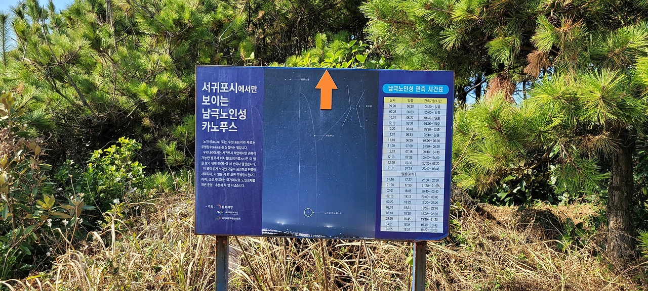 남극노인성 카노푸스. 다시 해안도로로 나오는 길목에 남극노인성 관측 시간표와 관측 방향을 표시한 안내판이 세워져 있다.