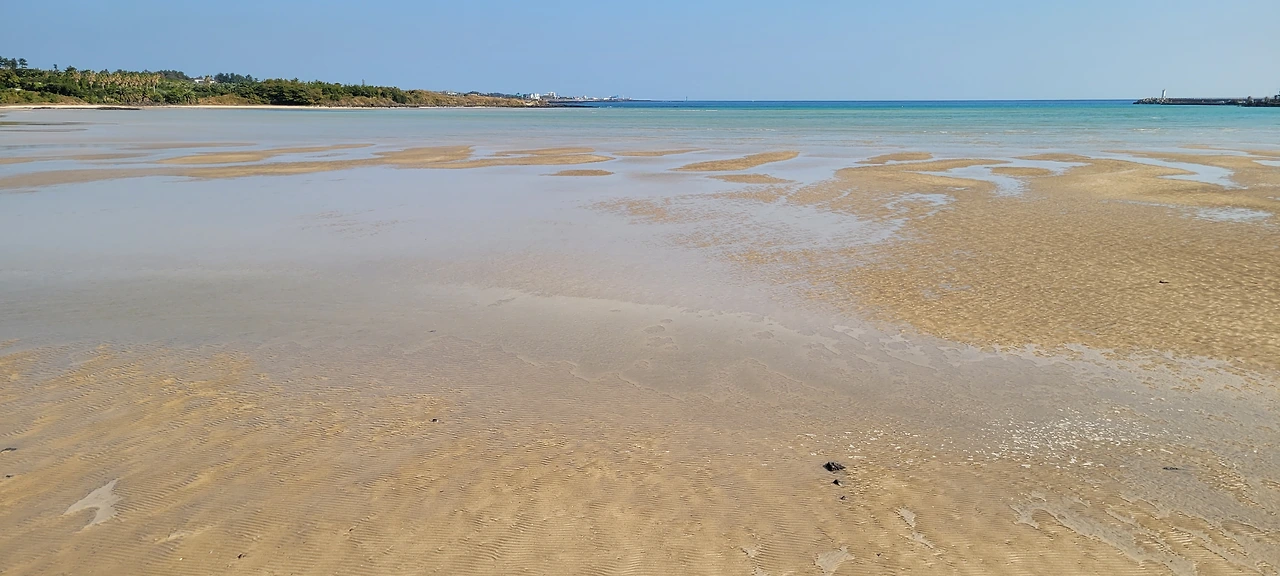 오늘의 걷기는 물 빠진 흔적이 아름다운 표선해수욕장에서 시작한다. 썰물 때면 바닷물이 멀리까지 빠져나간다. 활 모양의 원형 백사장이 생기고, 해수면은 수평선과 함께 가느다랗게 보인다. 물이 밀려들어오면 해수욕장은 수심이 얕은 호수처럼 된다. 아이들이 물놀이, 모래놀이하기에 좋은 곳이다.