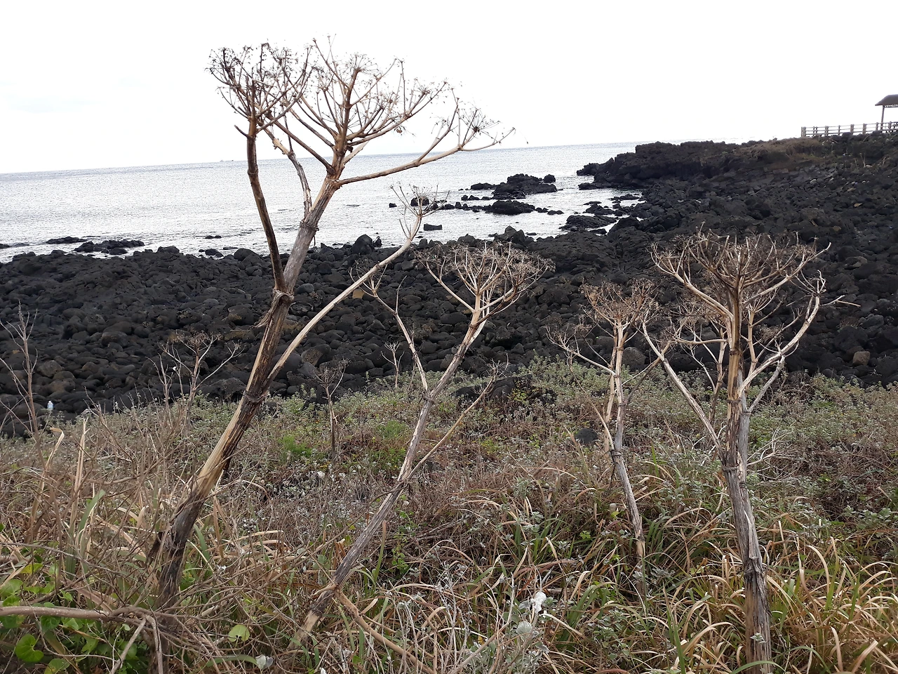 봄, 여름에 걸쳐 제주도 해변에 보초를 서던 '갯강활'이 이제는 제 소임을 '털머위'에게 물려주고 벼락 맞은 고사목처럼 말라가고 있다.