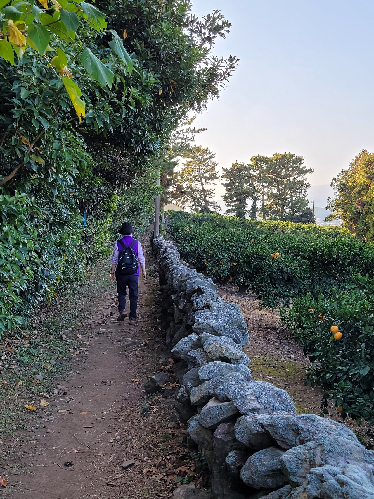 해변을 지나 농장과 밭이 있는 마을로 들어선다. 길 끝 지점에 제주 감귤농원 교육생 농장이 길손을 반긴다. 들어와 물 한잔 마시고 가란다. 올레는 아파트도 있는 주택가를 지나며 사람 사는 모습을 보여주다가 다시 해변으로 연결된다.