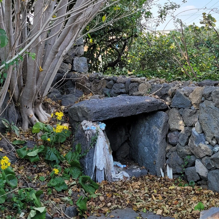 그중 갯당은 바다를 끼고 살아가는 사람들의 무사안녕과 풍어를 기원하는 곳입니다. 큰 바위나 아름드리 신목이 있는 곳에 제단을 만들고 그 위에 지전, 물색 천, 명실을 걸어 놓습니다. 어떤 마을은 테왁을 신목 위에 걸쳐 놓기도 했답니다. 해녀들의 목숨 줄 같은 테왁을 바치며 무탈하게 물질하고 올 수 있기를 기원하는 행위라 볼 수 있지요."