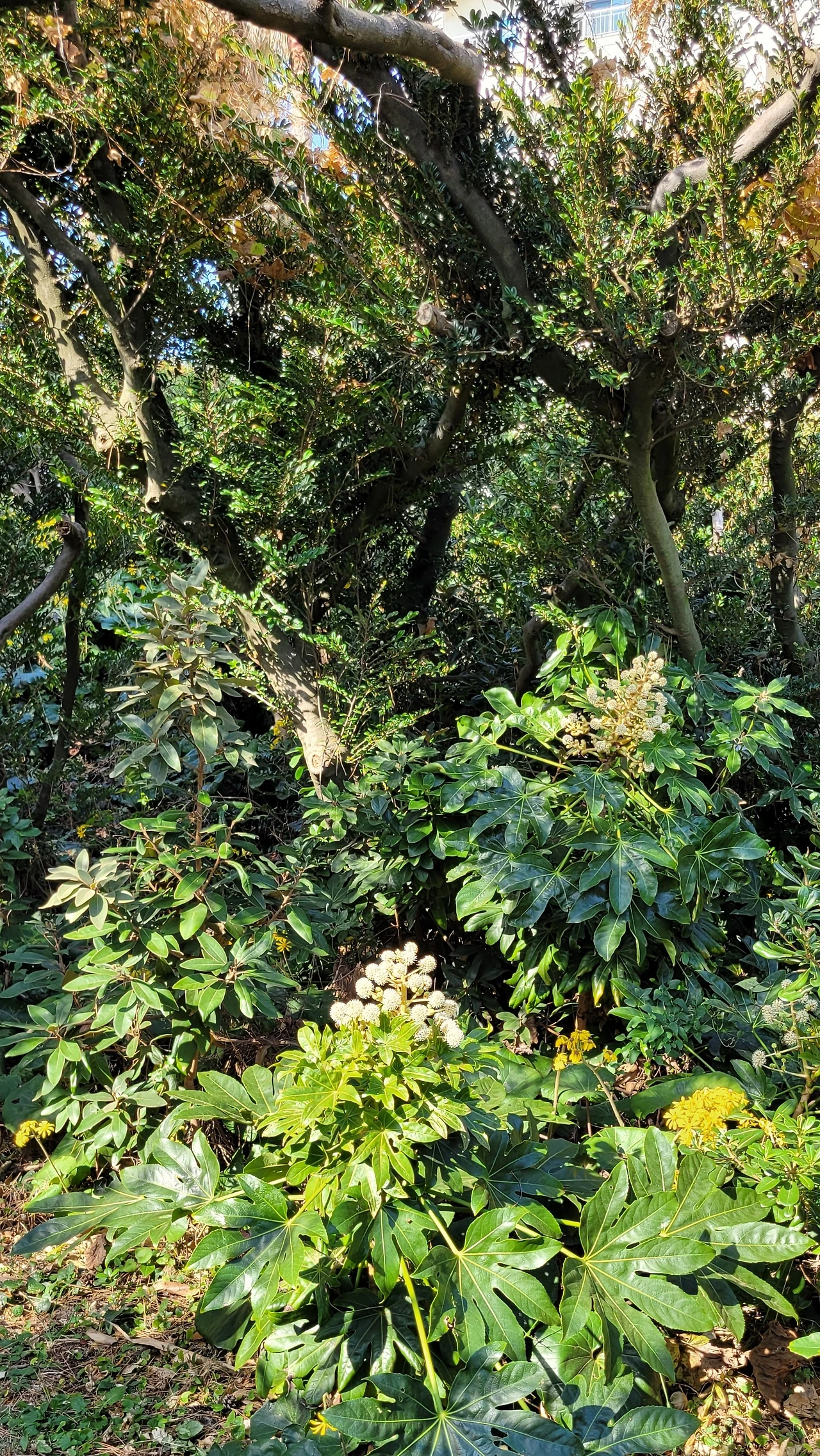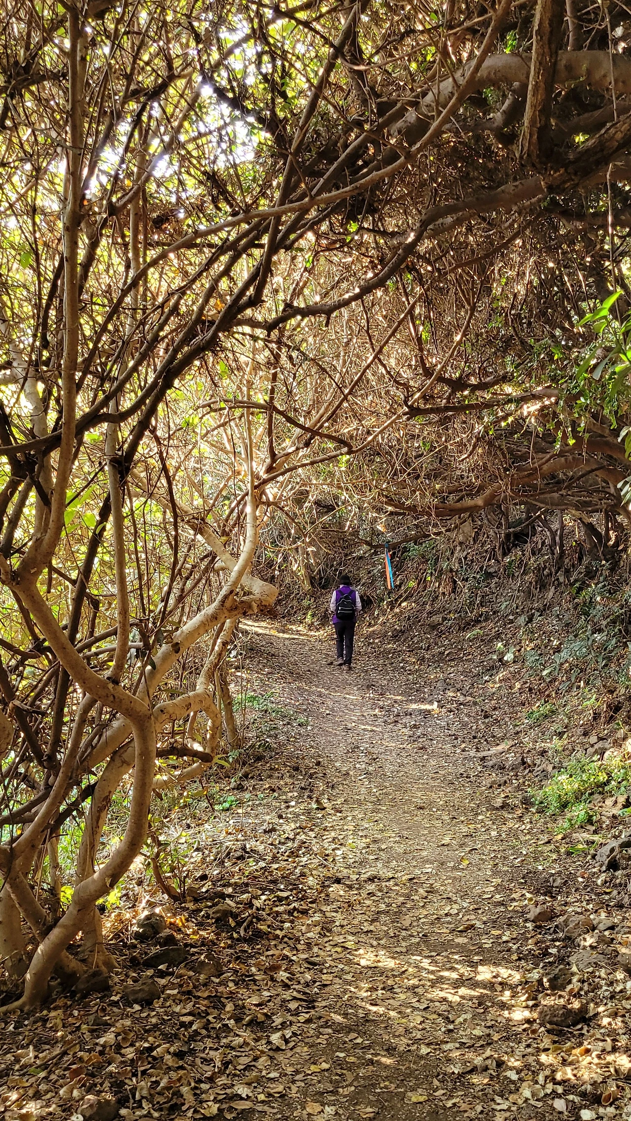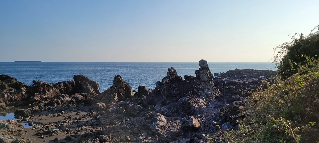 큰엉을 연상케 하는 숲길을 지나간다. 보리장나무, 아왜나무, 곰솔나무, 광나무, 협죽도 등등의 난대성 다양한 수목과 도깨비쇠고비, 고사리도 무리 지어 자라고 있다. 호젓하기보다 동행이 없으면 긴장이 됨직한 하늘이 보이지 않는 수목 터널이 이어지는 산길이다. '경찰과 함께 하는 안심 올레길'이라는 슬로건이 쓰여 있는 128 전투경찰대 관리 시설물이 괜히 지키고 있겠는가.