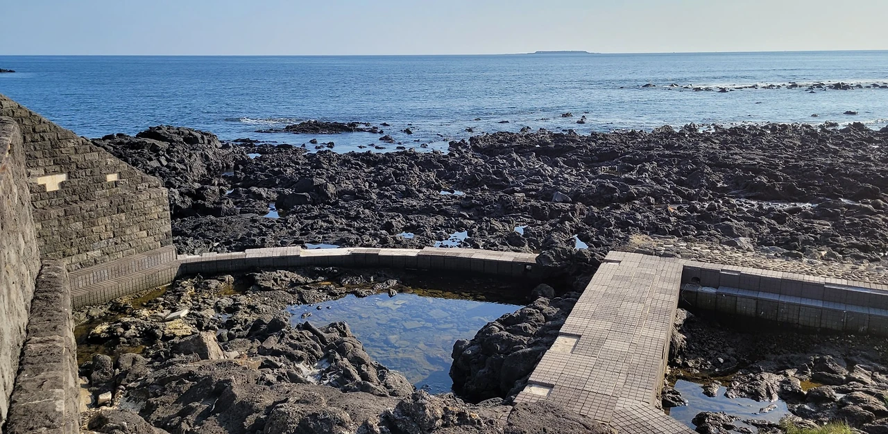 넙빌레. 포토존 오른편 사각형 사이로 지귀도가 나지막하게 수평선에 붙어 있다. 왼쪽이 여탕이고, 오른쪽은 남탕이다.