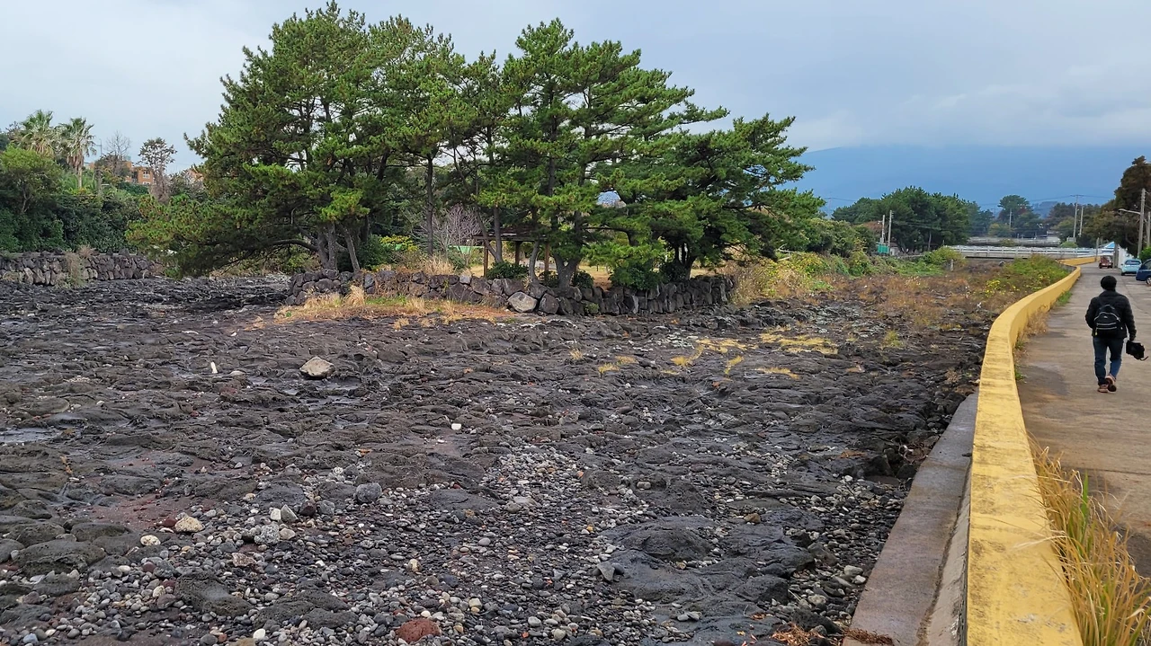 인동초 돌담길. 밭담이 길게 이어지고 길 양쪽으로 밀감밭이다. 흔히 인동초라고 불리는 '인동덩굴'이 울타리로 심어진 키 큰 나무들을 타고 오르던 곳이다. 인동덩굴의 꽃은 지고 잎 마저 말라 떨어지니, 몸을 제공했던 키 큰 나무들의 모습이 제대로 드러난다.