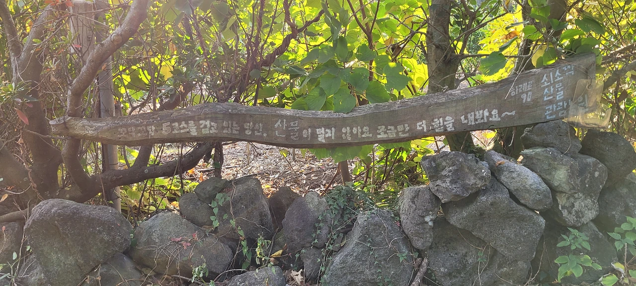 밀감농장 돌담 위에 설치된 선전문. '꼬닥 꼬닥 5코스를 걷고 있는 당신. 산물이 멀지 않아요. 조금만 더 힘을 내 봐요.' 광고도 예쁘게 하네.