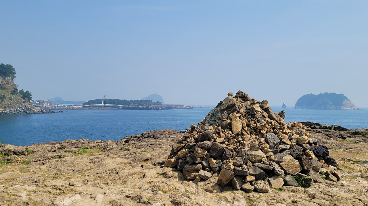 동너븐덕에는 '서귀포 칠십리' 노래비가 서 있고, 뒤로 새연교와 새섬, 섶섬, 문섬이 차례로 보인다.