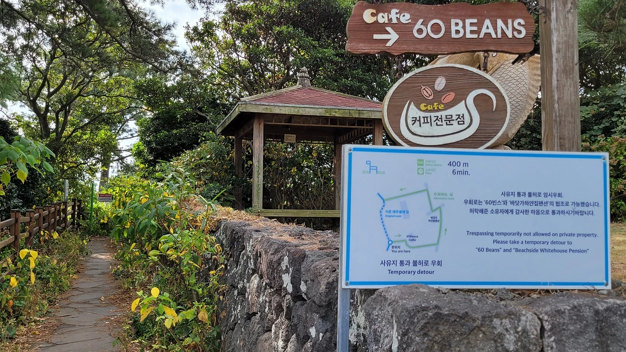 사유지를 내어준 소유자에게 감사하는 마음으로 길을 조용하게 깨끗이 사용하자는 호소문과 함께, 400m 6분 우회하라는 안내문이 세워져 있다.