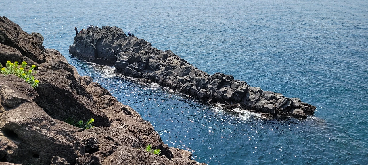 고개를 서쪽으로 좀 더 돌리면 무근덕에 연결되어 튀어나온 우두암, 쇠머리코지와 서너븐덕이 들락날락하며 해안선을 이어간다. 그 해안선 안쪽으로 외돌개가 지키고 섰고, 멀리 범섬이 외곽 수비를 맡은 경비초소처럼 수평선 위에 떠 있다.