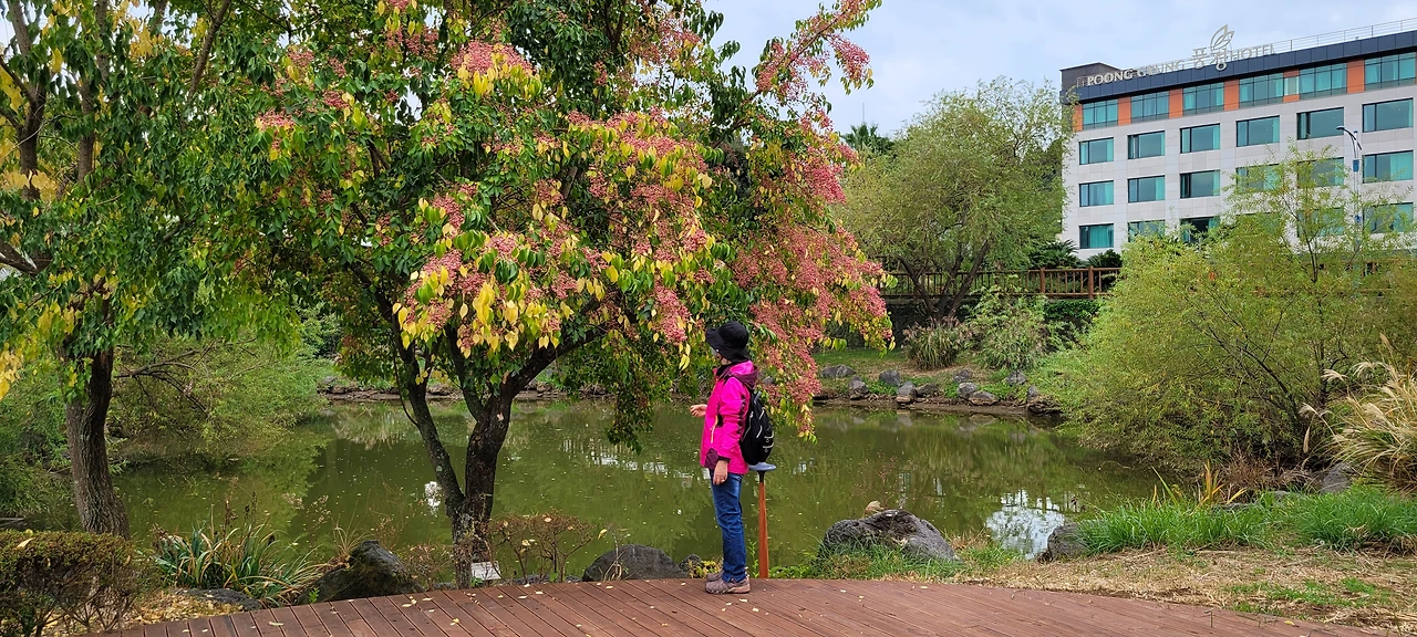 무엇보다도 공원에서 내려다보는 천지연 폭포가 장관이다. 자매도시 가시마시와의 한일 우호 친선 매화공원이끝나는 지점에 포토존이 있다. 시를 읽으며 걷다보면 난대림 속에 숨은 비경을 놓치기 쉽다.