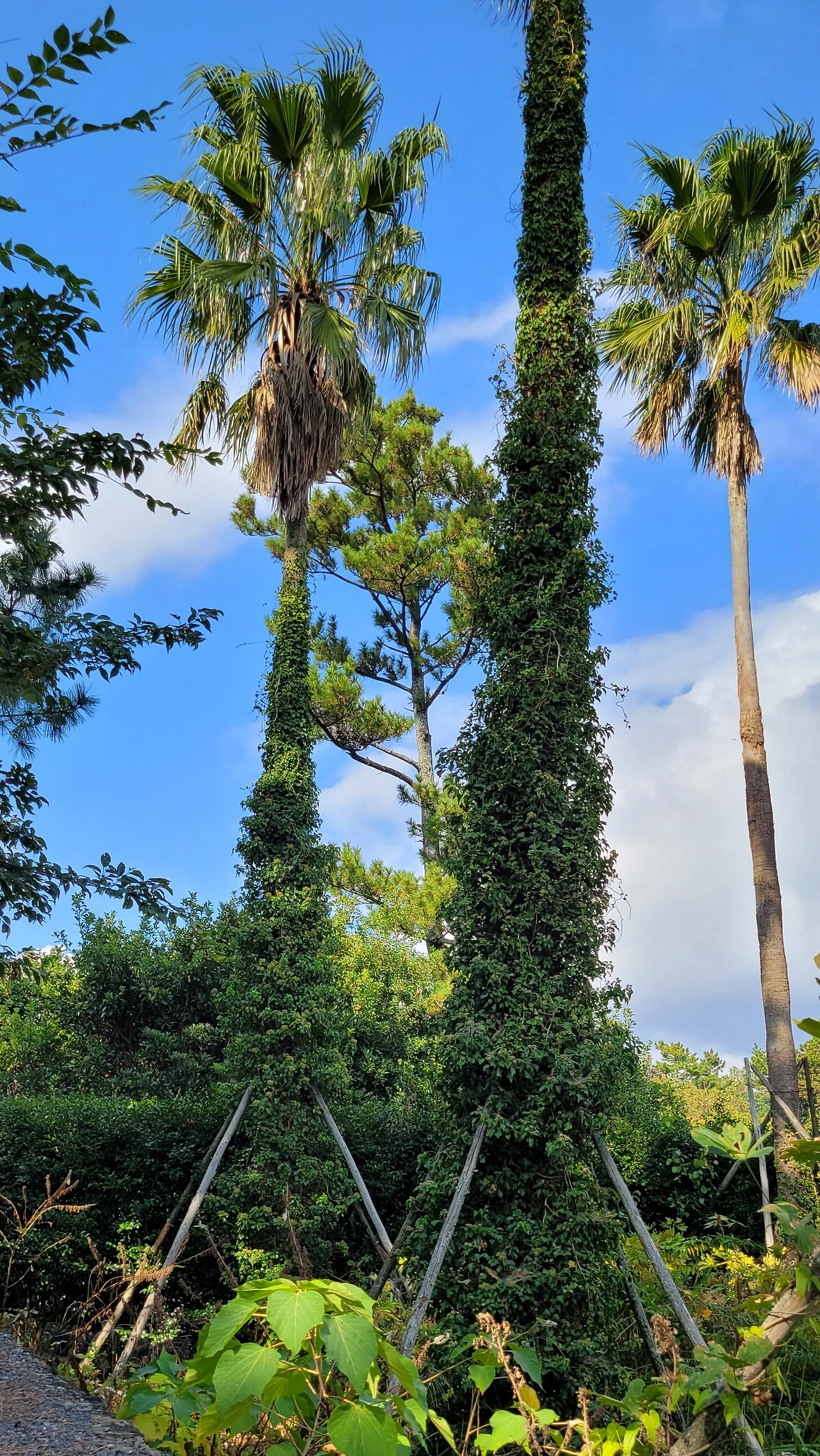 키 큰 야자수를 덩굴식물이 감아 오른다.