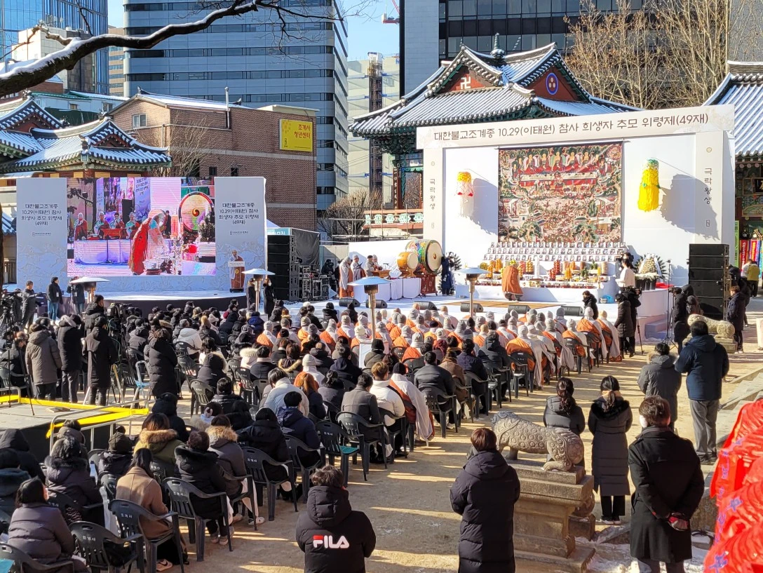 이태원 핼러윈 참사가 발생한 지 49일째인 12월 16일(금) 오전 10시, 조계사 대웅전 앞마당에서 '10.29 참사 희생자 추모 위령제'가 열렸다. 대한불교조계종은 조계사 극락전 앞에 특별 제단을 마련했다. 희생자 67분의 영정과 위패 78위를 모시고 49재의 전통불교 의식으로 이승을 떠나는 고인의 명복을 빌었다.
