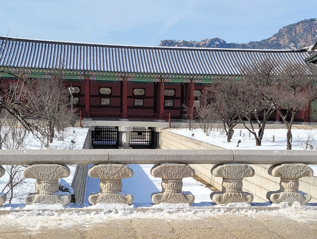 하지만 하얀 눈을 덮어쓰고 물길을 내려다보며 웅크리고 있는 돌짐승 네 마리는 무섭다기보다 해학적이고 맹랑한 표정을 짓고 있다. 혀를 날름 내고 있는 모습이다. 왕궁의 위엄을 지키면서 군왕의 너그러움을 동시에 나타내는 여유를 느끼게 한다. 왕의 밝은 은혜가 온누리에 미치기를 기원하는 석공의 마음이 서려 있다.