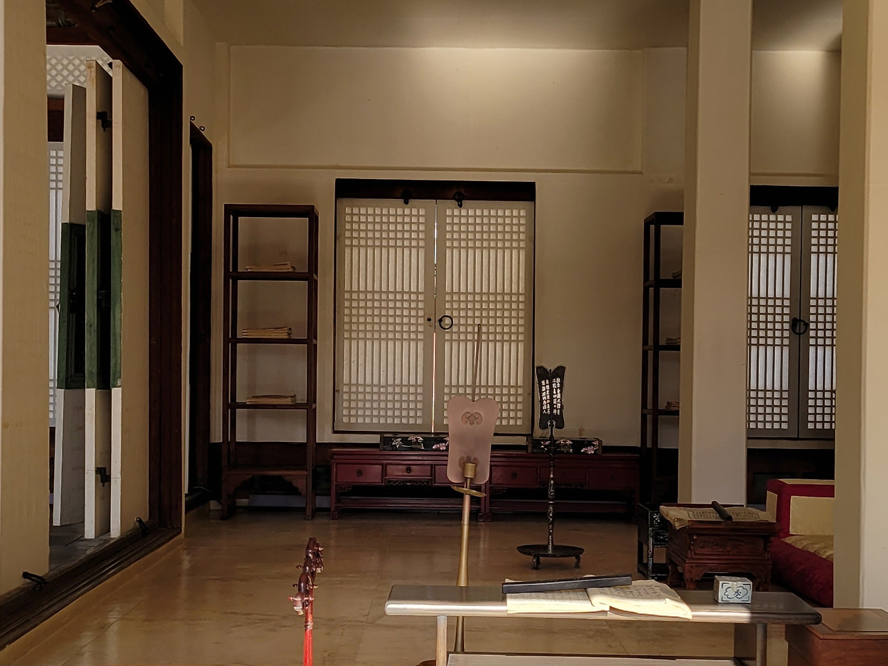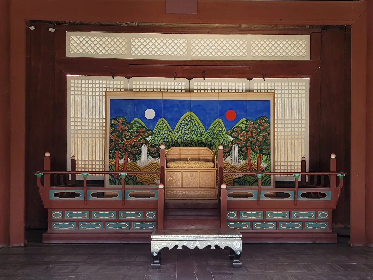 어좌 앞쪽의 좌우에는 낮은 탁자가 각각 하나씩 놓여 있다. 실록의 원고가 되는 사초를 기록하는 사관(史官)이 앉았던 자리다.