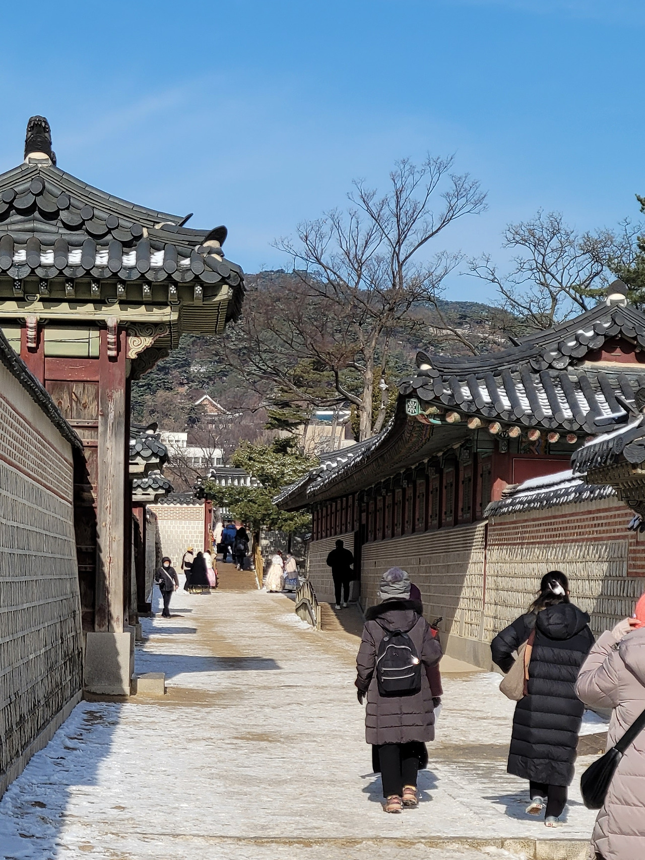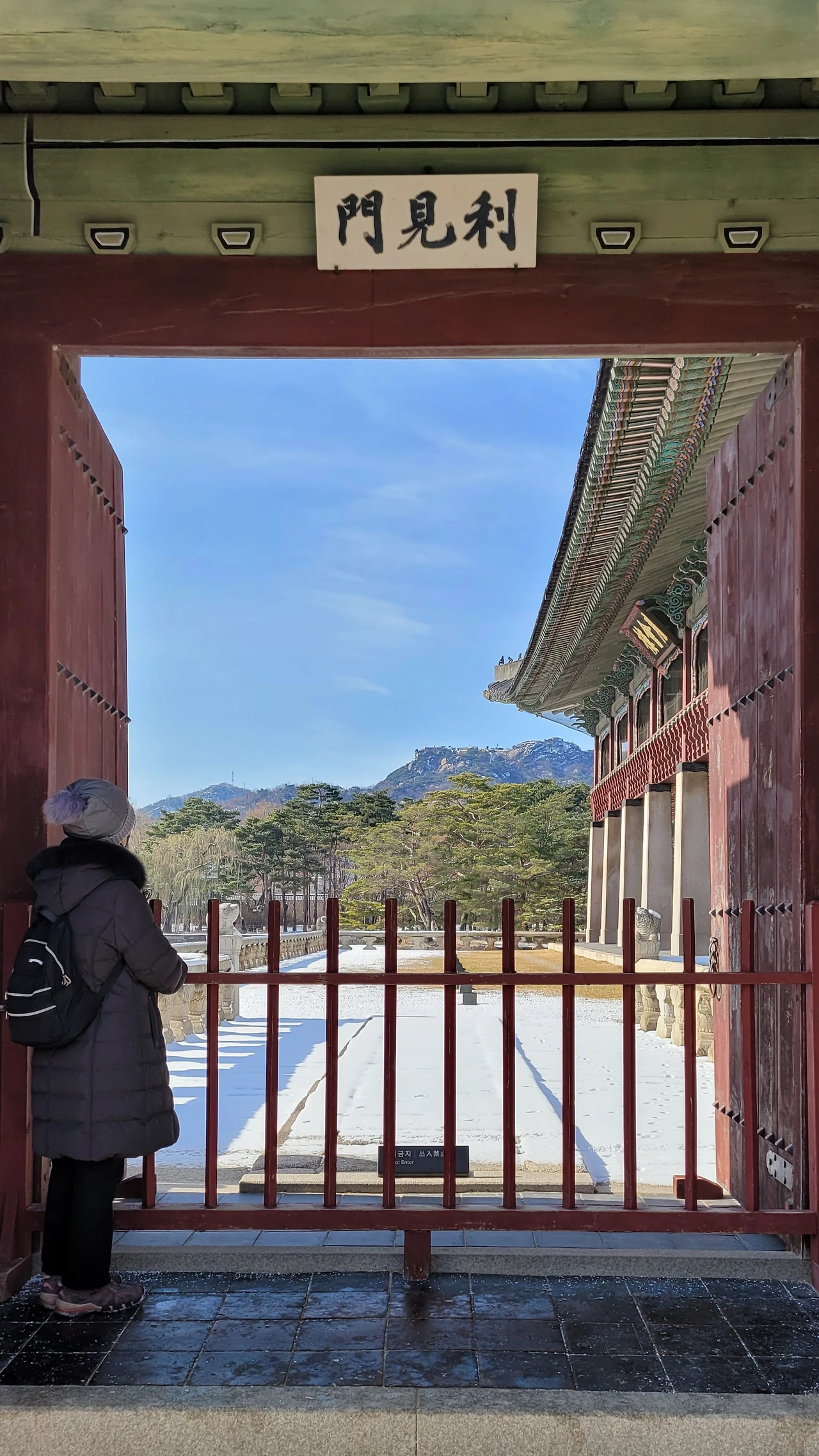 "이견문은 '대인을 만나 본다'라는 뜻으로 '하늘에 나는 용이 있으니 좋은 정치를 하기 위해서는 좋은 신하들을 두어야 한다'것을 의미합니다. 여기서 보는 경치가 참 아름답습니다. 사진 한 장씩 찍으시지요. 문 사이로 보이는 인왕산이 문과 잘 아울립니다."