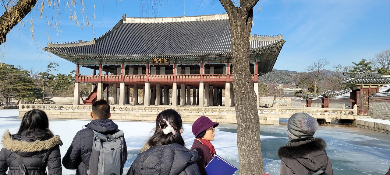 "여러분 경회루에 왔습니다. '더불어 기쁘게 만난다.'라는 의미를 가진 경회루는 임금과 신하가 만나서 연회를 하거나 외국 사신을 접대하는 곳입니다. 한마디로 '경복궁의 꽃'과 같은 곳이지요."