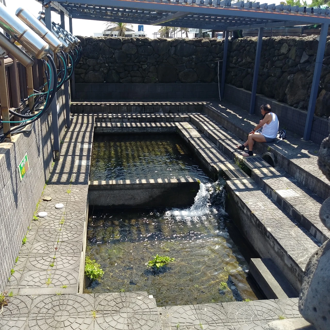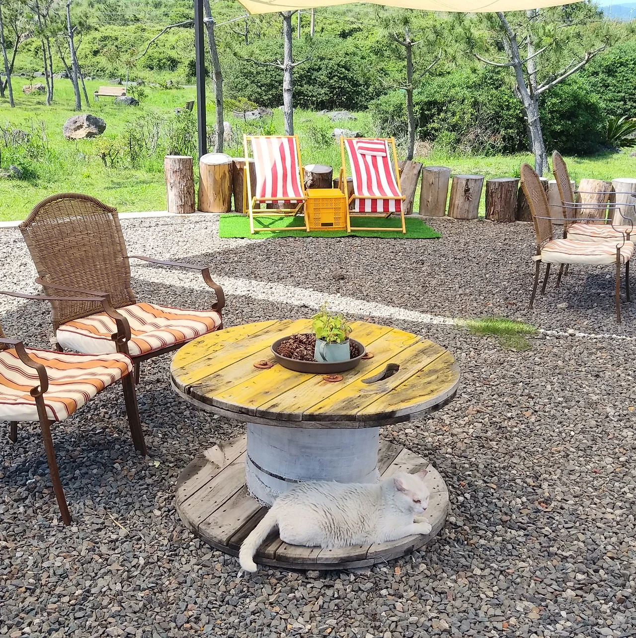 바다로 흘러드는 용천수의 수량이 많아 둑을 막아 풀장과 샤워장을 조성해 놓아 논짓물은 여름 물놀이 장소로 인기가 높다. 논짓물 카페에서 쉬어간다. 탁자 밑에 고양이가 졸고 있다.