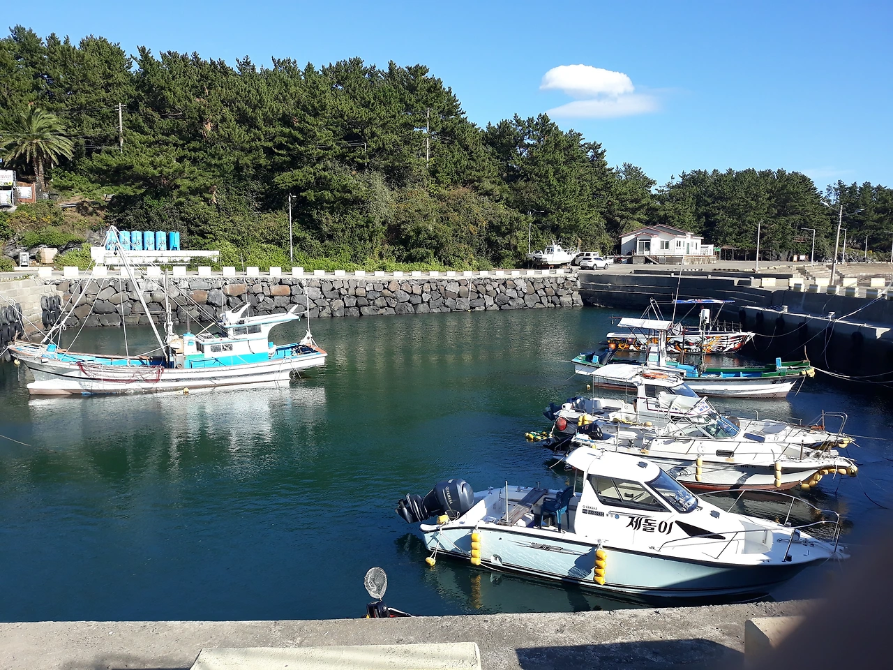 예래(하예)포구. 배낚시 체험을 위한 낚싯배가 정박해 있는 작은 포구다. 주변에 진황등대, 해신당, 당포연대 등의 유적지가 있고, 박수기정 절벽과 산방산이 한눈에 들어오는 동난드르 쉼터가 있다.