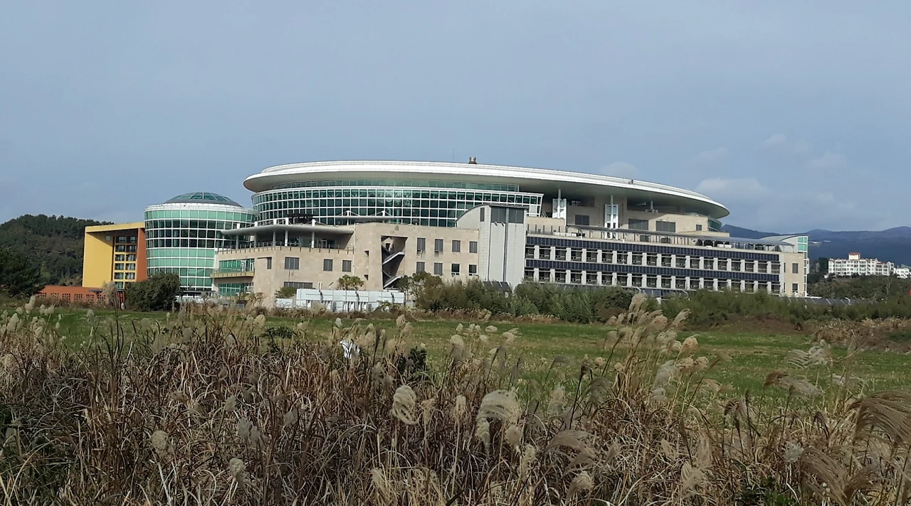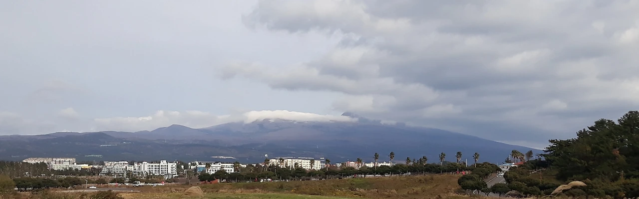 대포주상절리대를 나와 왼편 담벼락을 따라 걷는다. 오른편으로 컨벤션 센터가 가까이 보이고, 한라산 정상은 흰 구름에 싸여 구름 모자를 쓰고 있다.