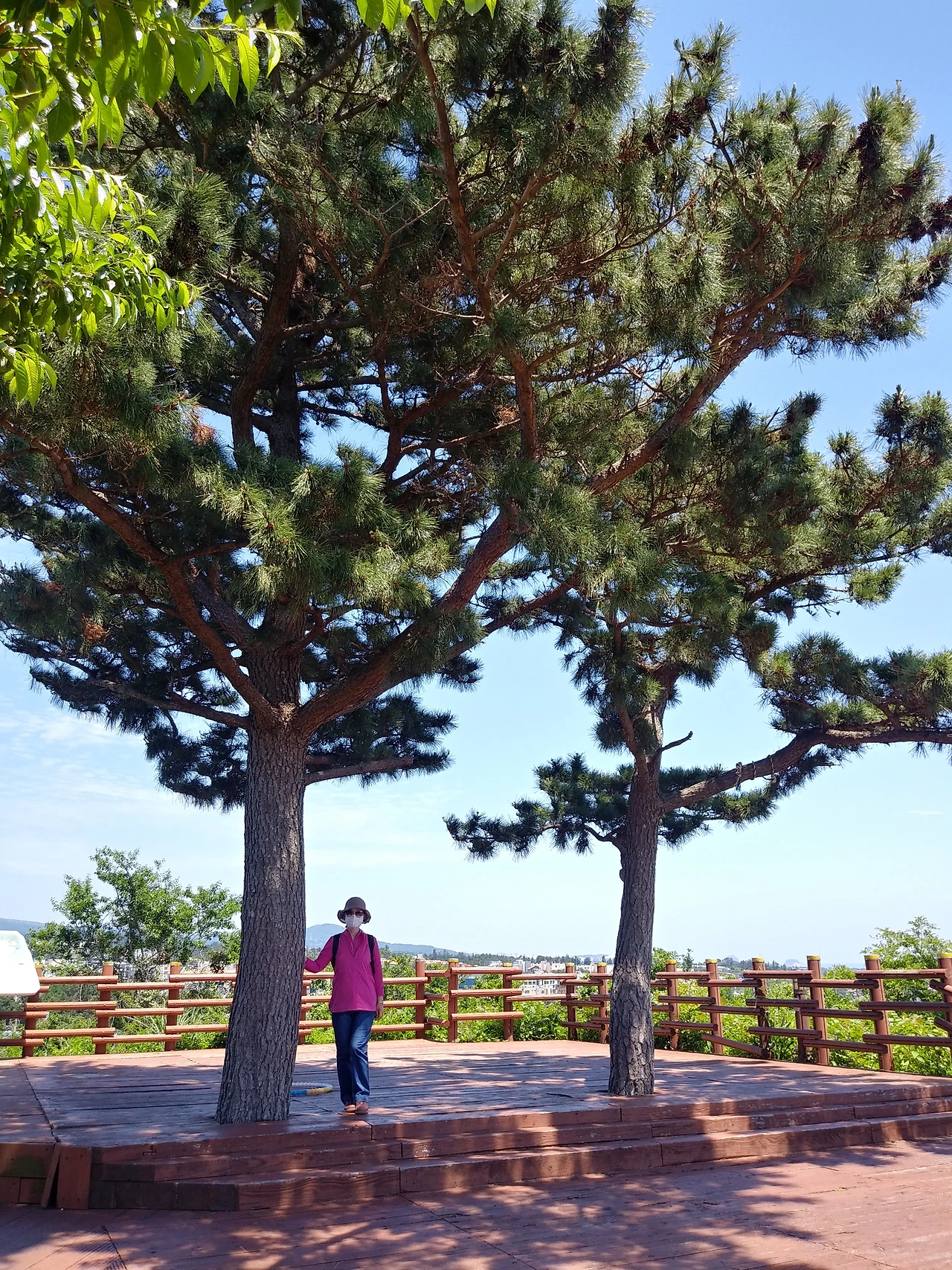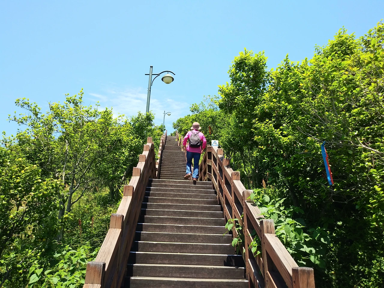 올레8길 안내를 따라 쉽게 정상을 오를 수 있다. 중간에 쉼터가 있다. 마스크도 쓰지 않고 뒤에 따라 오르는 두 사람이 신경이 쓰인다. 대체로 마스크 안 쓴 사람은 말을 많이 한다. 쉬기도 할 겸 먼저 보내주고 해변을 내려다 본다.