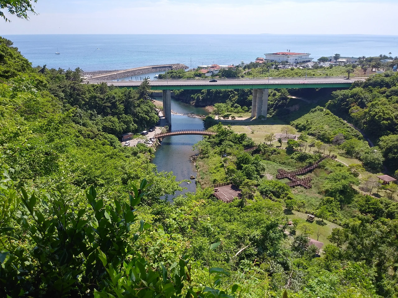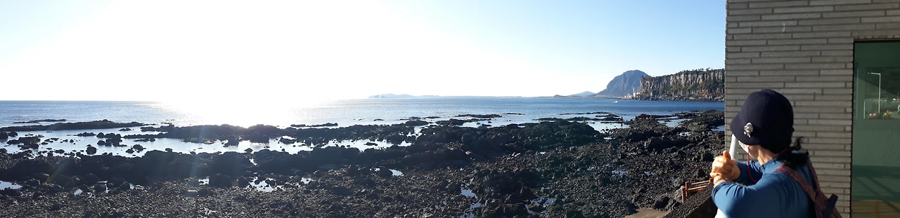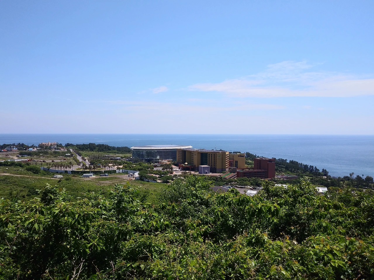앞으로 내려다본다. 컨벤션 센터와 대포 주상절리대 앞바다가 보인다.