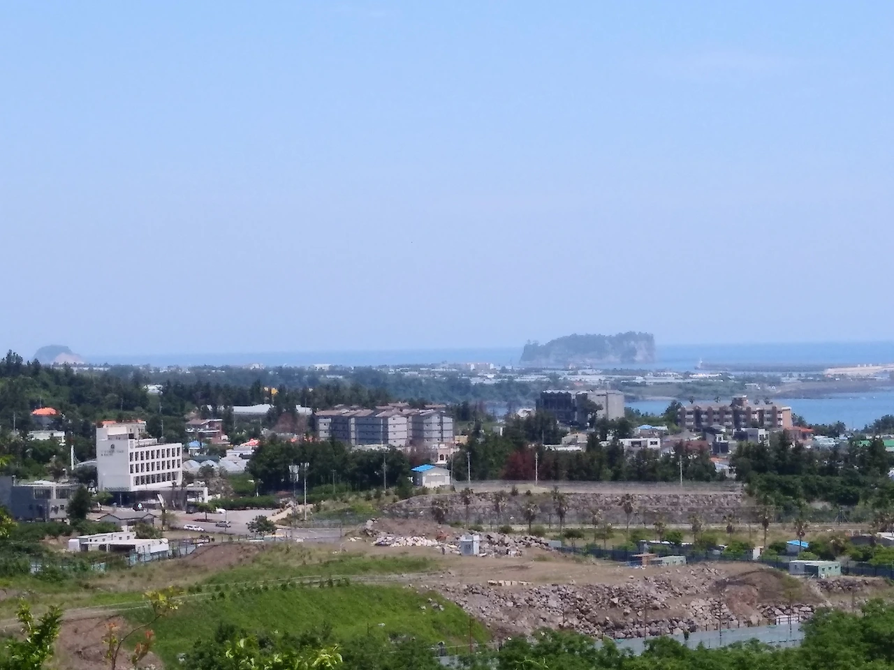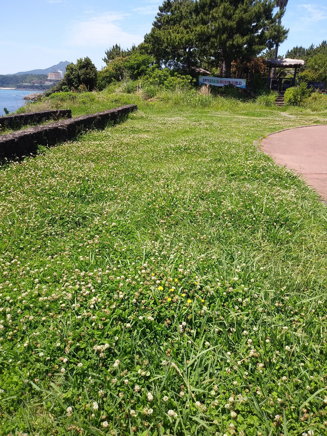 부영리조트 옆, 토끼풀 밭에서 멀리 군산과 중문대포주상절리의 대미를 장식하는 박수기정을 바라본다. 그 앞이 색달해수욕장이다.