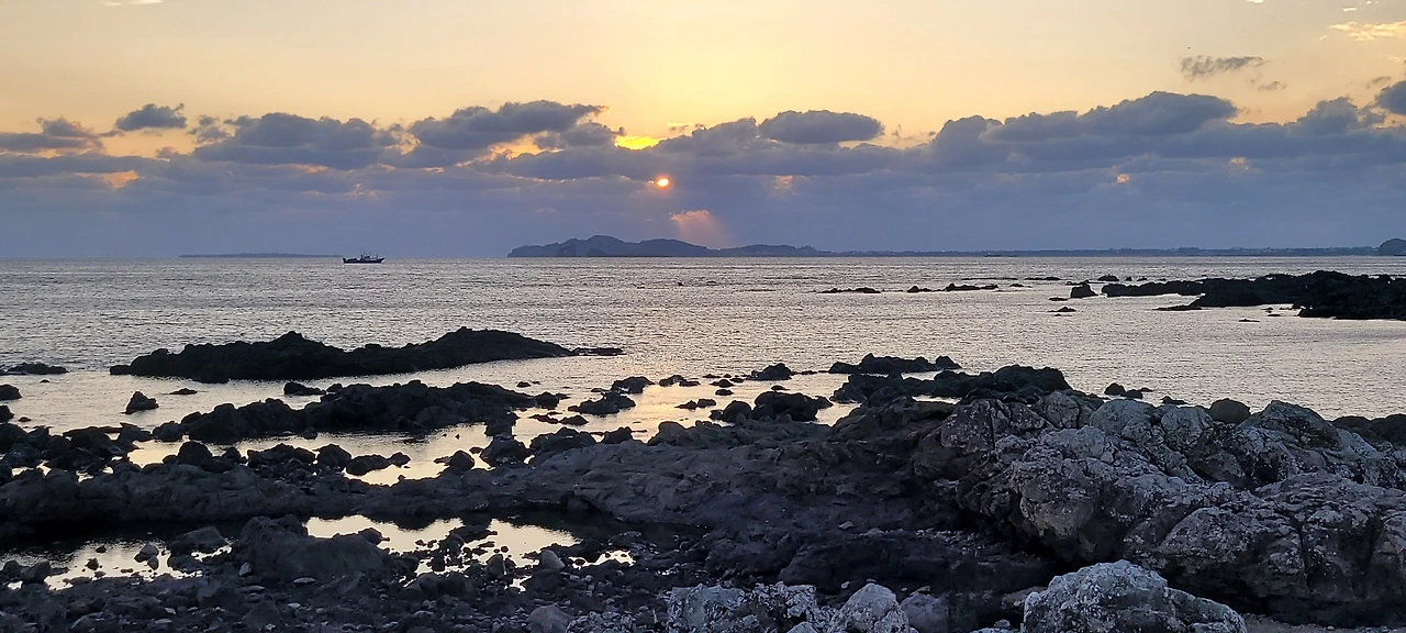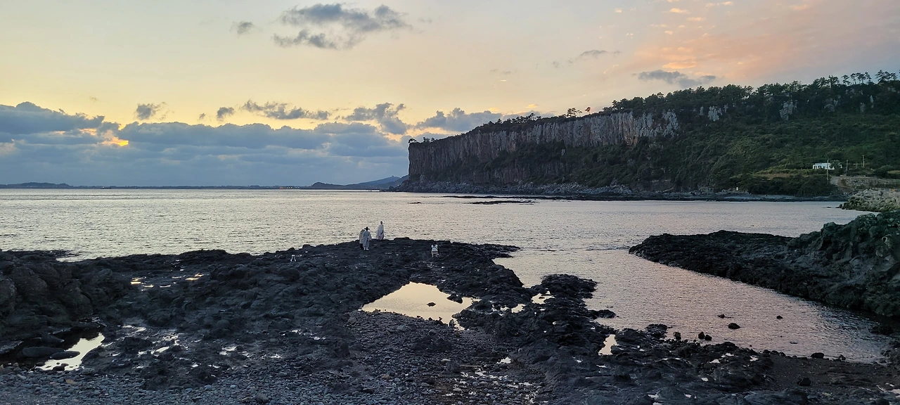 대평포구에 들어서니 병풍처럼 펼쳐진 박수기정의 웅대한 모습이 다가온다. 해질녘 구름 사이로 삐져나오는 노을과 바다에 내려앉은 노을은 절벽과 어우러져 신비로움을 펼친다. 웨딩 촬영하는 신랑 신부가 환상적인 장면을 연출하고 있다.