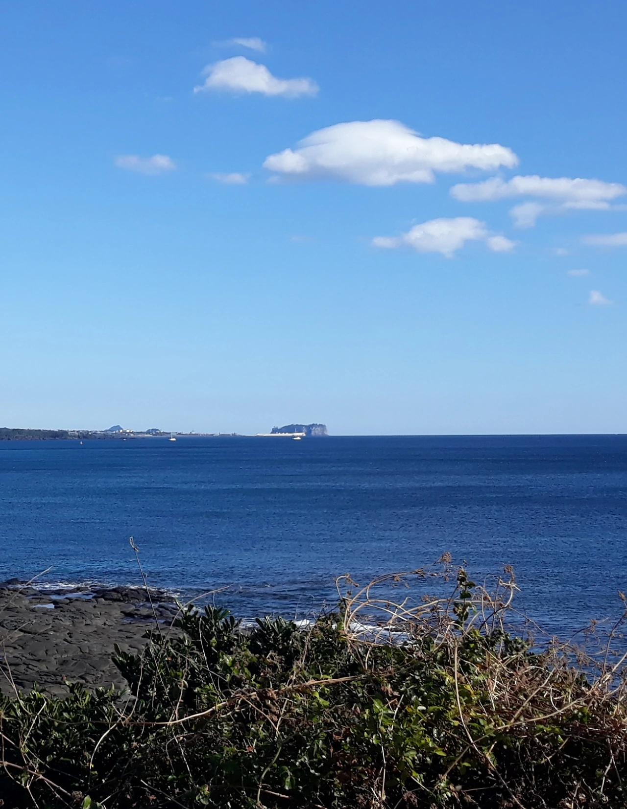 동쪽으로 뒤돌아보니 멀리 범섬, 섶섬, 문섬이 조그맣게 떠있다. 간결미가 돋보이는 조망이다.