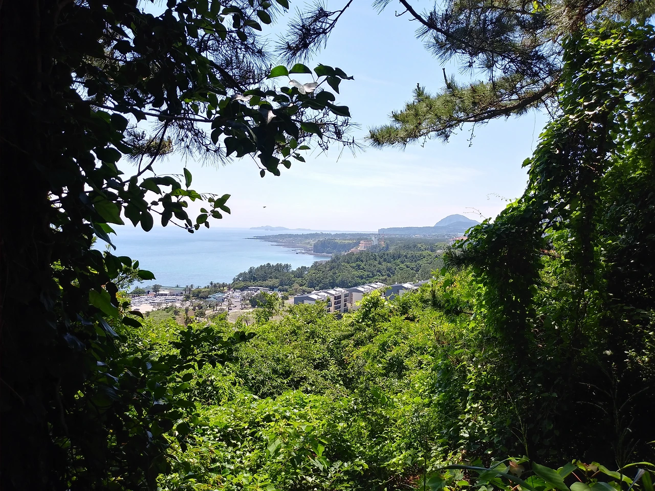 우거진 숲 사이로 베릿내 포구와 쉬리언덕, 중문관광단지 일대의 풍경이 멀리 산방산, 박수기정과 함께 그림처럼 펼쳐진다. 등산로는 경사가 완만해지고 갈림길이 나온다. 올레길 화살표가 양쪽에 표시되어 있다. 오른쪽의 순방향 표시를 따라 오른다.