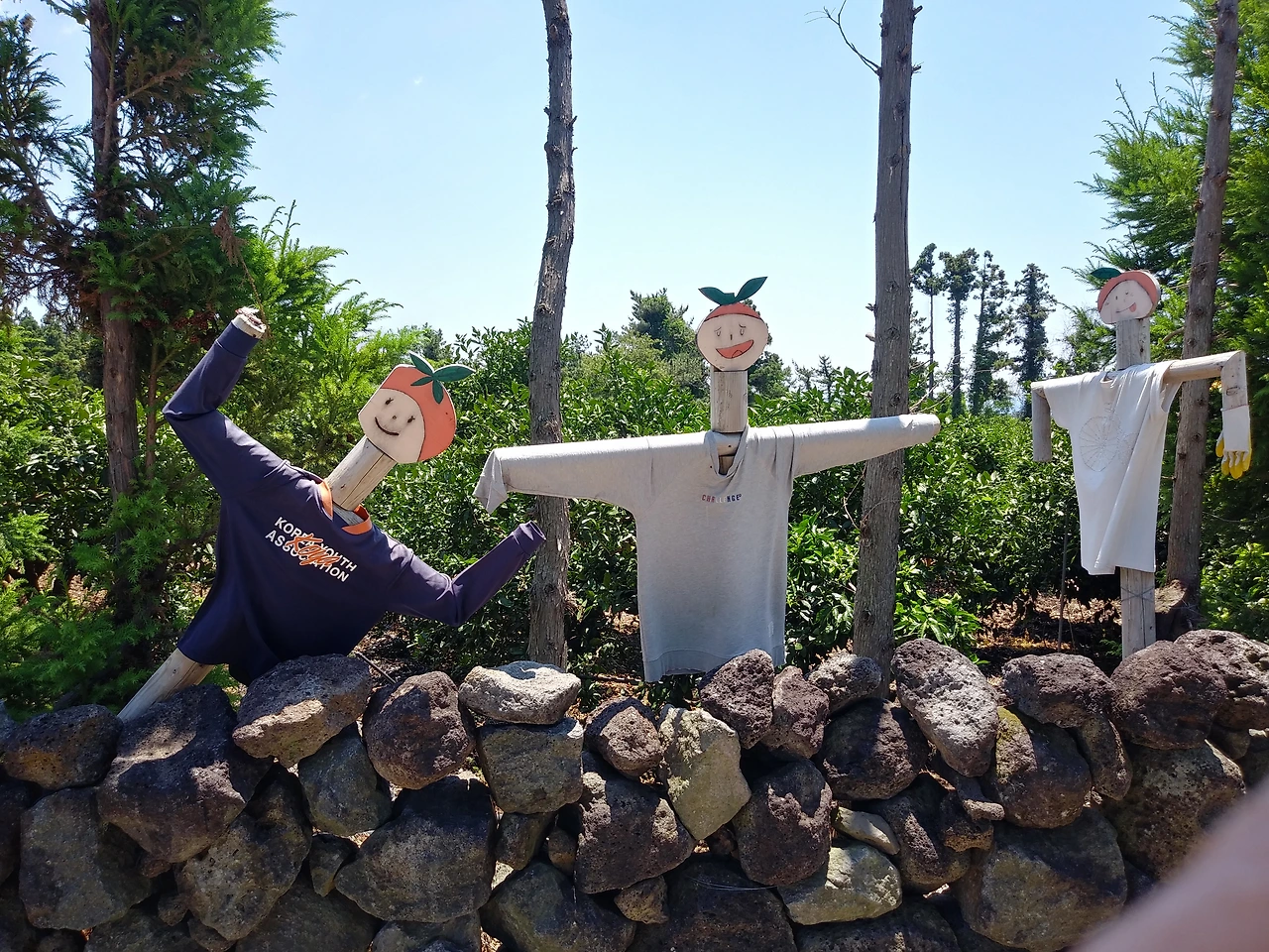 예래 입구 교차로에서 여래로를 따라 내려간다. 지루한 길을 걷는데 익살스러운 허수아비들이 분위기를 바꿔 놓는다. 감귤따기 체험장이다.