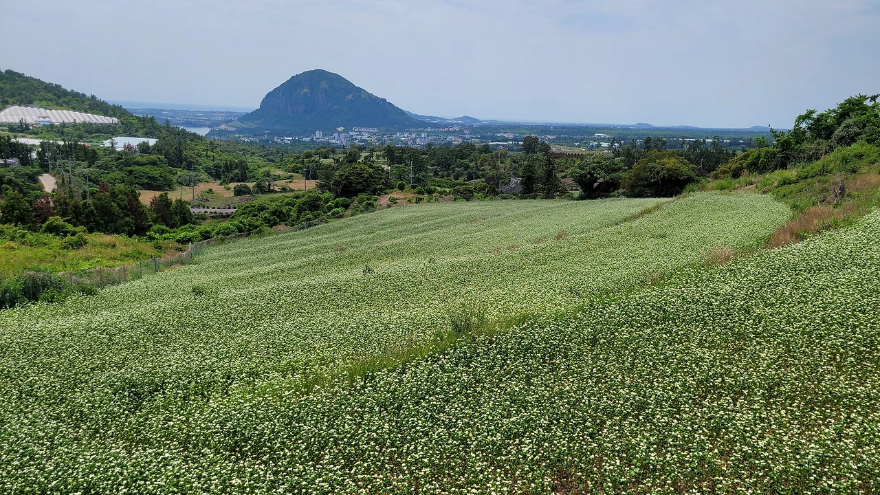 약천암 옆을 지나다가 돌아본 메밀밭과 산방산 전경
