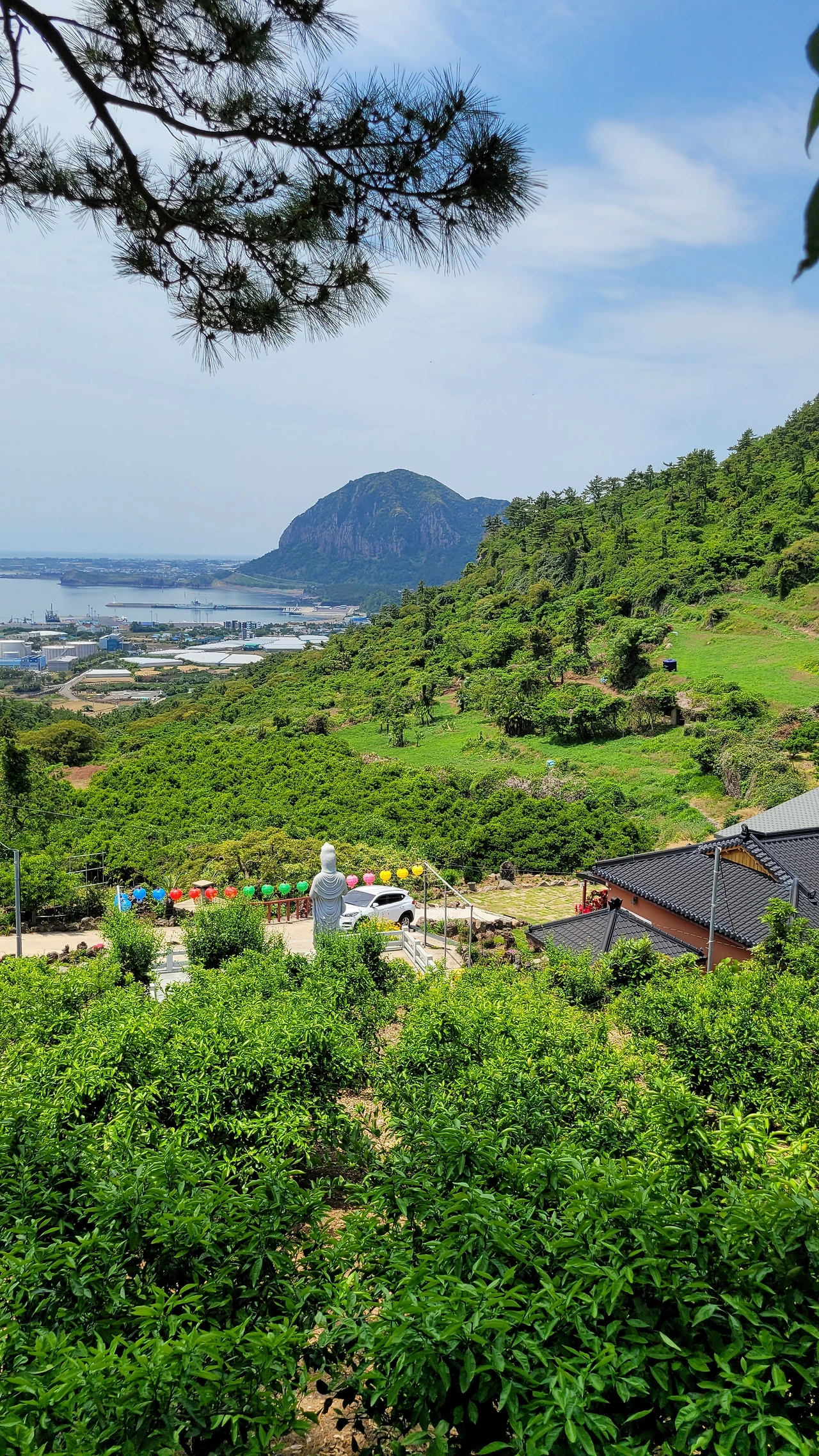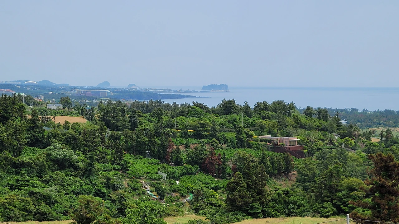군산이 가까이 다가오고, 멀리 범섬과 문섬, 섶섬이 서귀포 앞바다에 떠 있다. 강정항과 새연교가 도드라져 보이다. 파인애플과 비파가 심긴 농장이 펜션과 함께 나타난다.