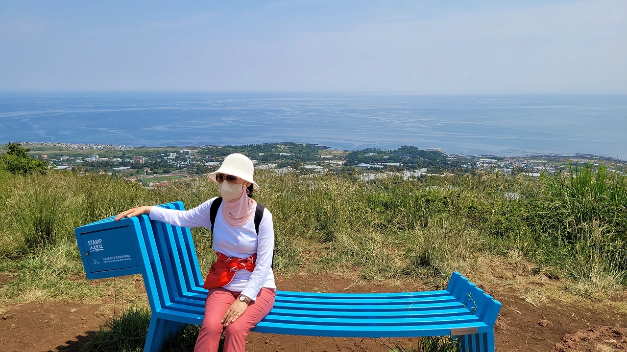 정상 앞에 긴 간세 벤치가 마련되어 있다. 올레9코스의 중간 기착지이다. 스탬프도 찍고 앉아서 땀을 식힌다. 군산은 제주의 오름 중 둘째가라면 서러울 만큼 빼어난 조망이 펼쳐지는 명소라 찾는 사람이 많다.