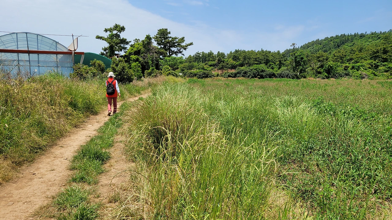 한밭입구에서 대평감산로를 만난다. 대평감산로는 안덕계곡 삼거리에 대평포구로 이어지는 도로로 택시를 타고 지나갔던 길이다. 길을 건너 창전리로 들어서서 군산으로 향한다.