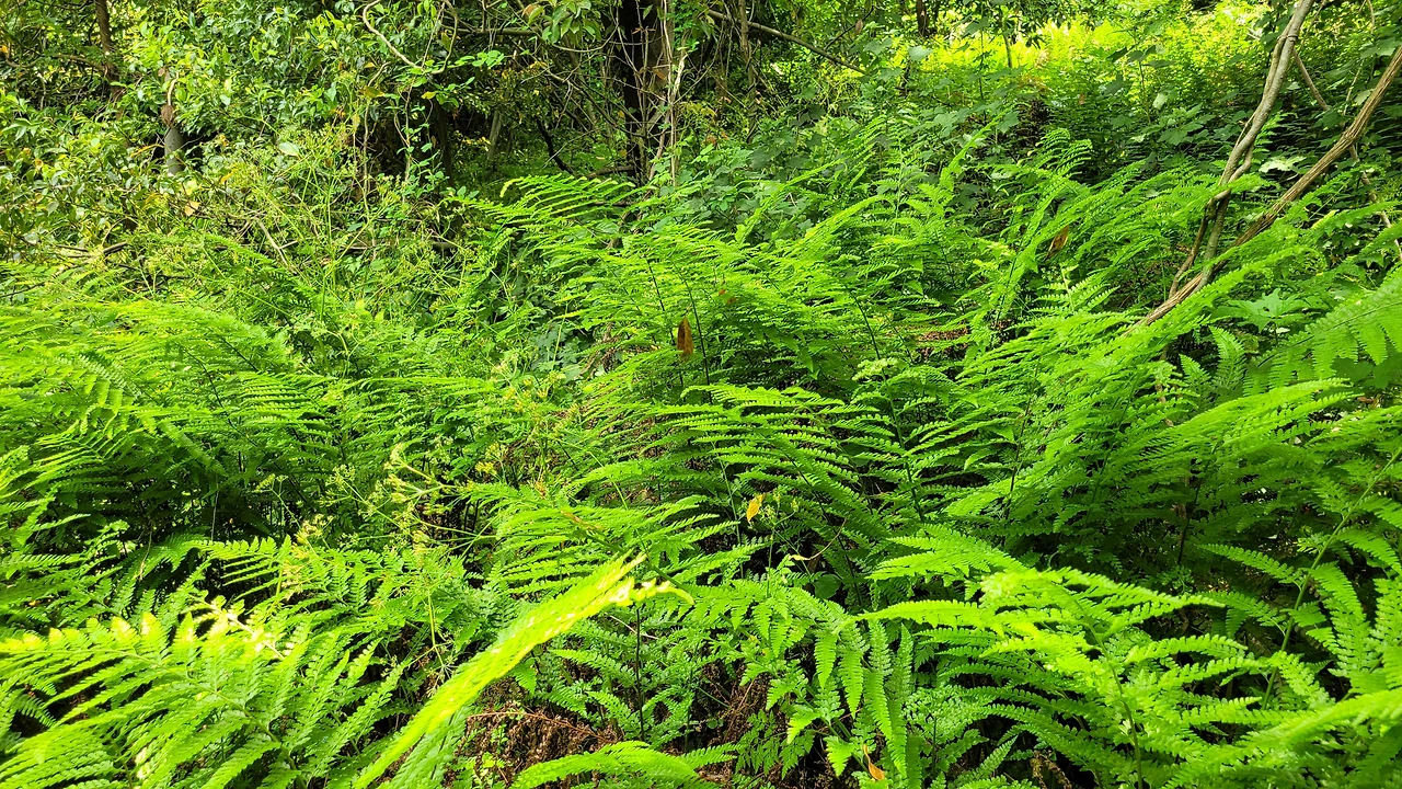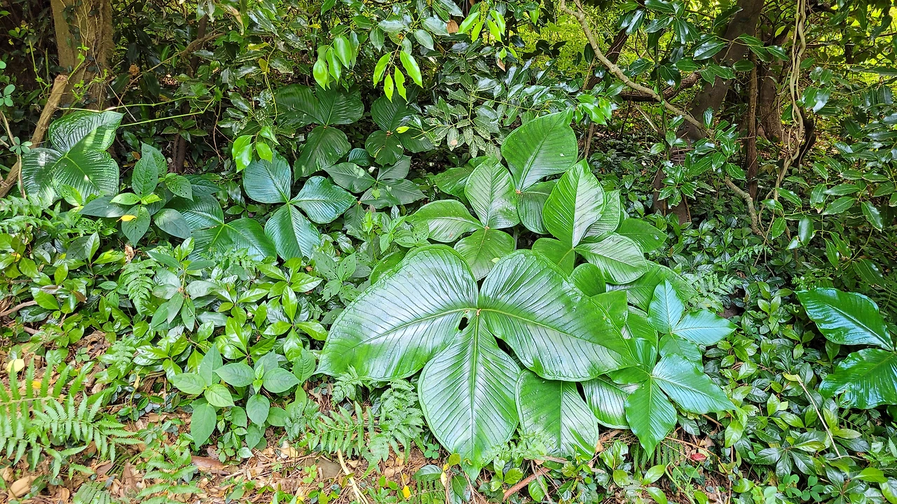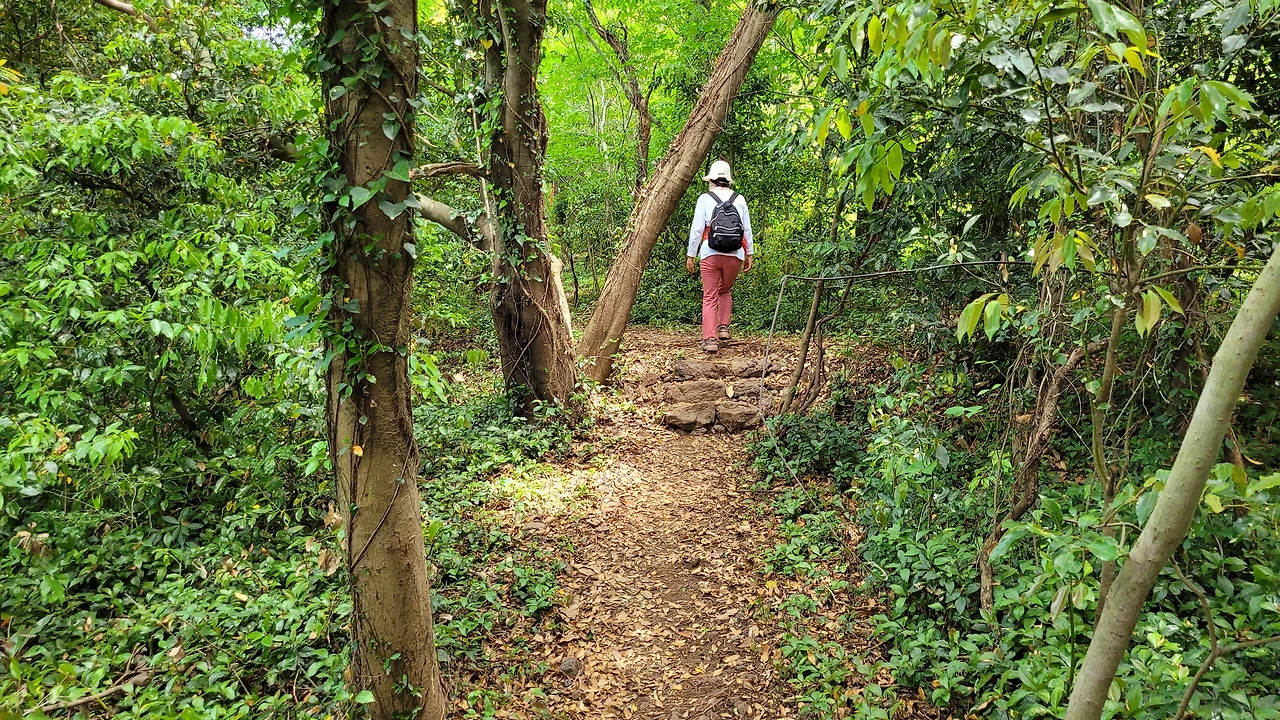 본격적으로 군산의 숲 속으로 들어선다. 상록성 교목들이 하늘을 가리고, 고사리와 유사한 개고사리와 큰천남성 등의 여러해살이풀이 지피를 덮고 있다. 한적한 오솔길이 이어진다.
