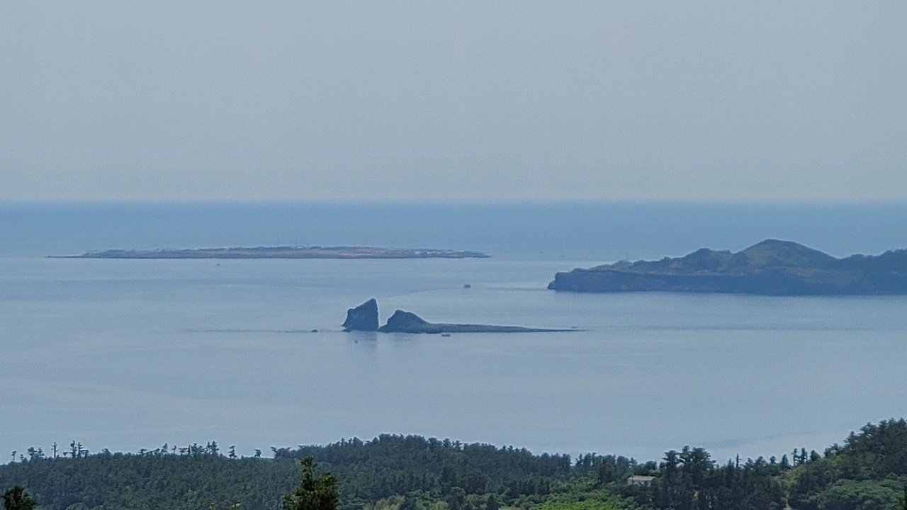 군산 간이 주차장에서 본 사계 앞바다. 형제섬, 송악산, 가파도가 눈에 들어온다.