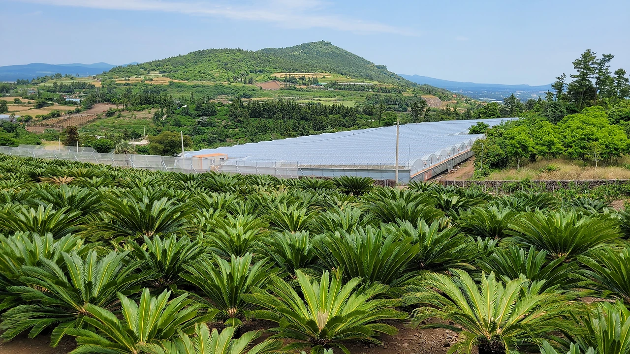 태흥사 삼거리에서 월라봉 옆으로 산방산과 용머리해안이 살짝 그 모습을 드러낸다. 차가 다닐 수 있는 농로를 따라 중산간 넓은 경작지가 이어진다.