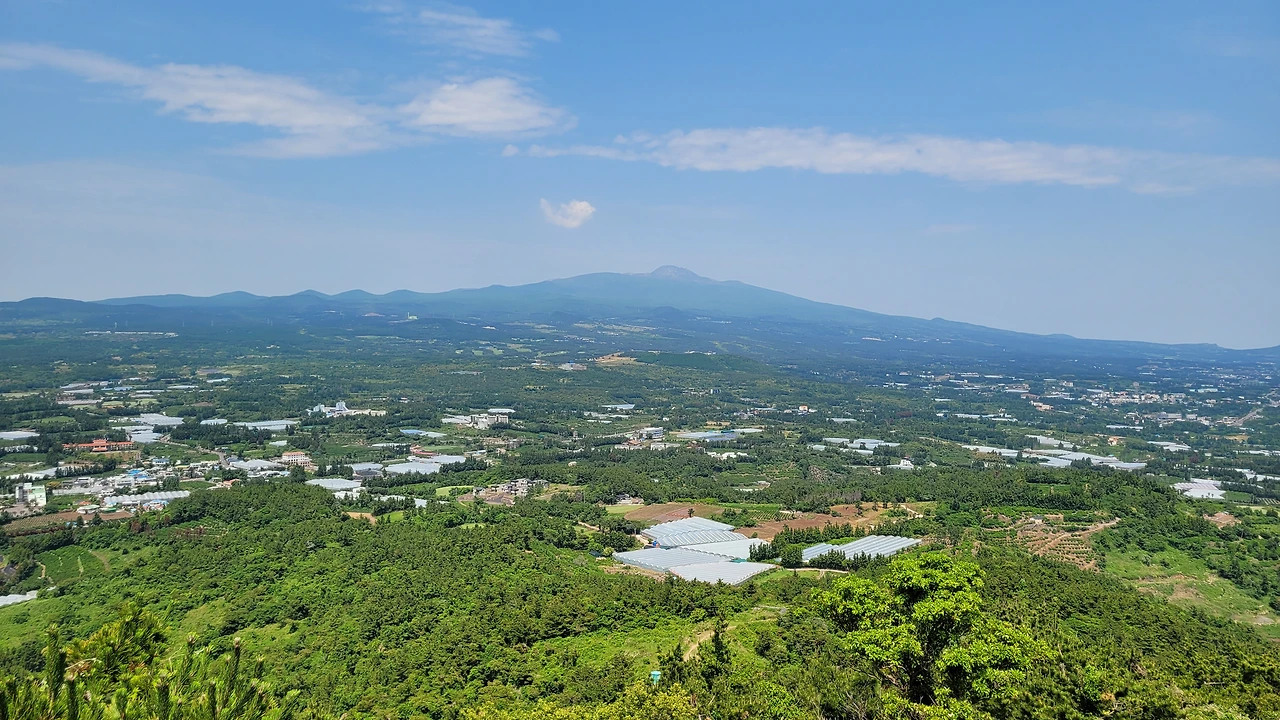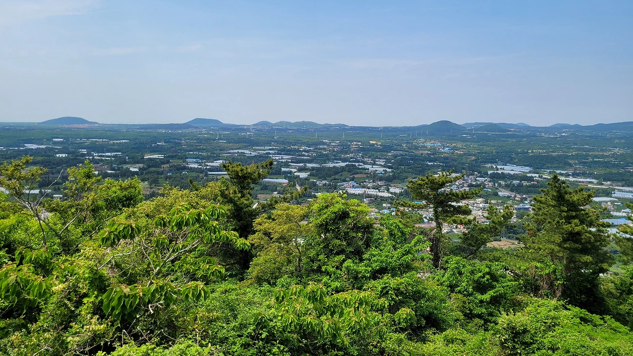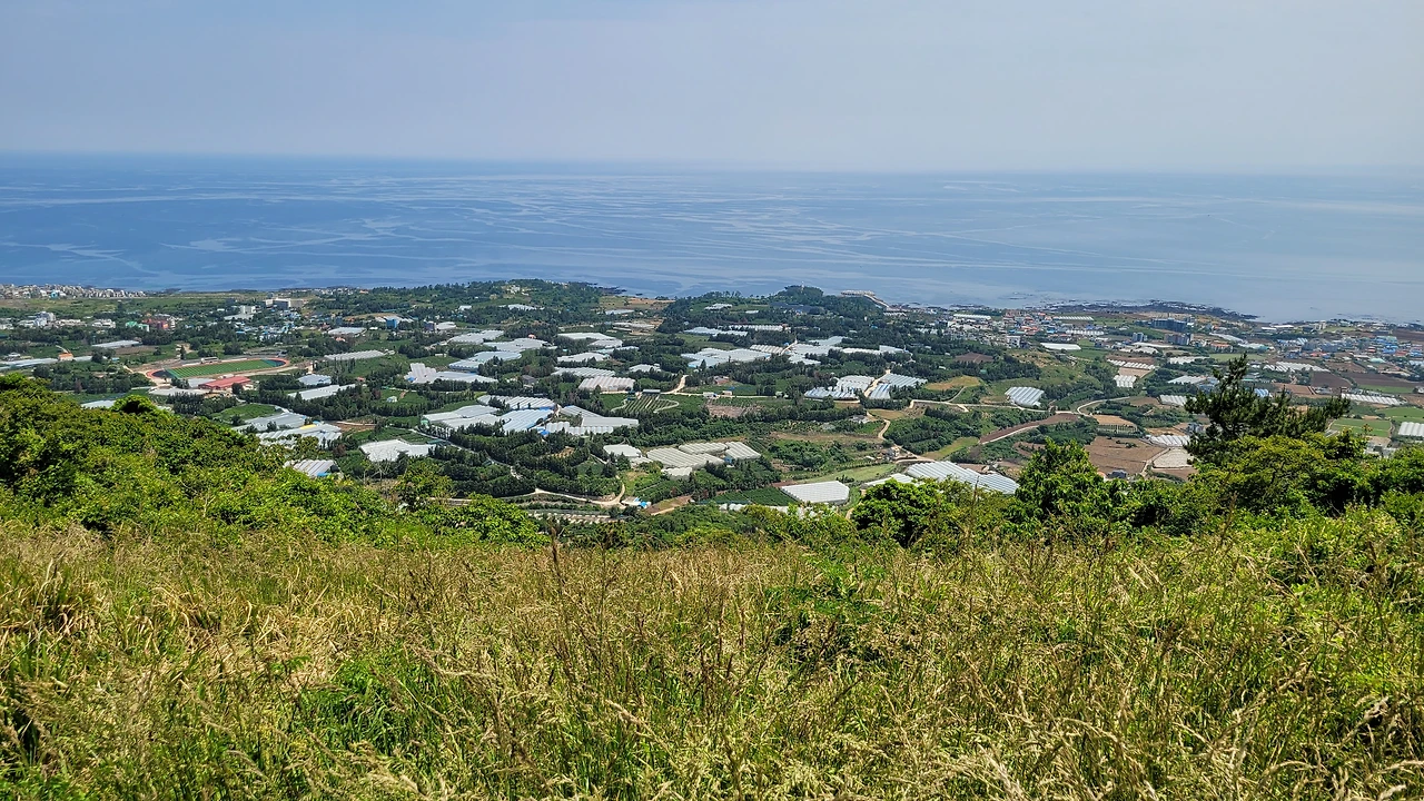 군산 정상에 서면 먼저 발아래의 안덕면이 보인다. 난드르 마을의 비닐하우스와 밭과 밭 사이의 경계를 이루는 숲이 조각천을 이어 만든 조각보처럼 아름답게 보인다.