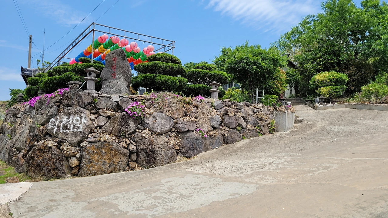 박수기정에서 걷기 시작하여 군산을 넘어 안덕계곡 가기까지 화장실이 없다. 물론 가게나 음식점도 없다. 용변을 볼만한 곳은 지나온 태흥사와 이곳 약천암 두 곳뿐이다. 약천암이 올레꾼 때문에 몸살을 앓는 모양이다. '수양 중인 암자이므로 일반인 출입금지'라는 올레 안내판이 서 있다.