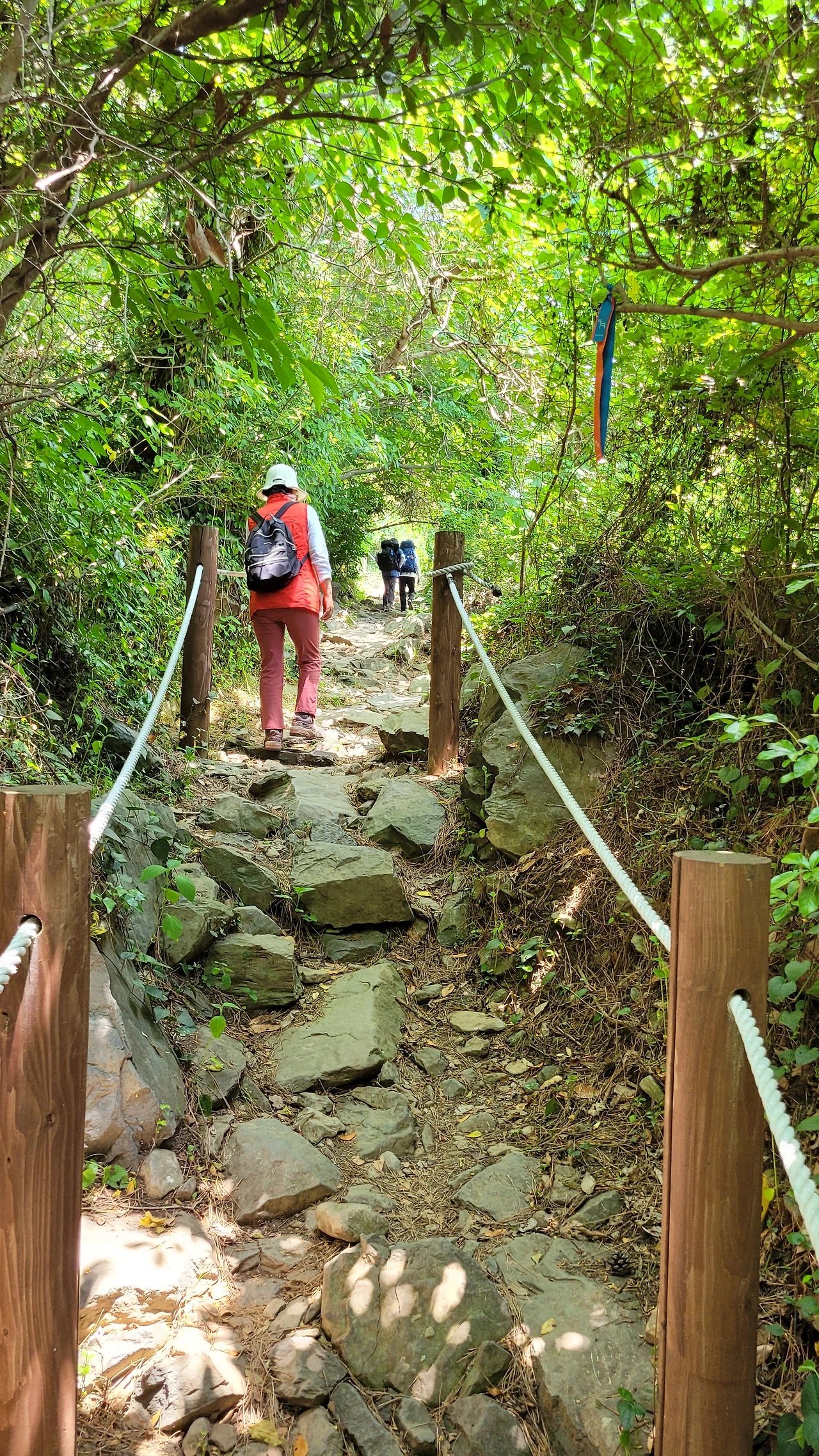 박수기정을 오르는 들머리부터 돌무더기가 울퉁불퉁 튀어나와 걷기 불편하다. 상록관목이 하늘을 가린 좁은 길의 숲향기가 코끝을 자극하여 기분이 상쾌하다. 오르막이 계속되어 제법 숨이 찬다. 15분 정도면 올라가니 걸을만하다.