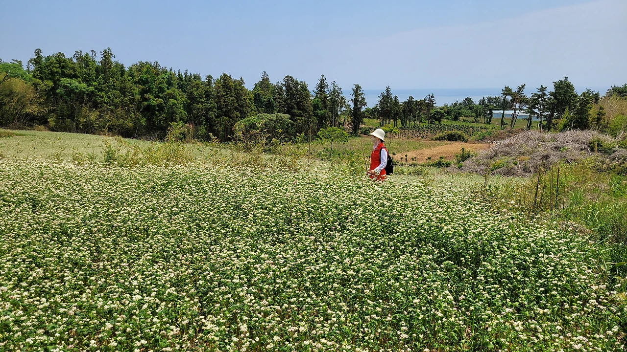 넓은 메밀밭의 흰꽃이 바람에 일렁인다.