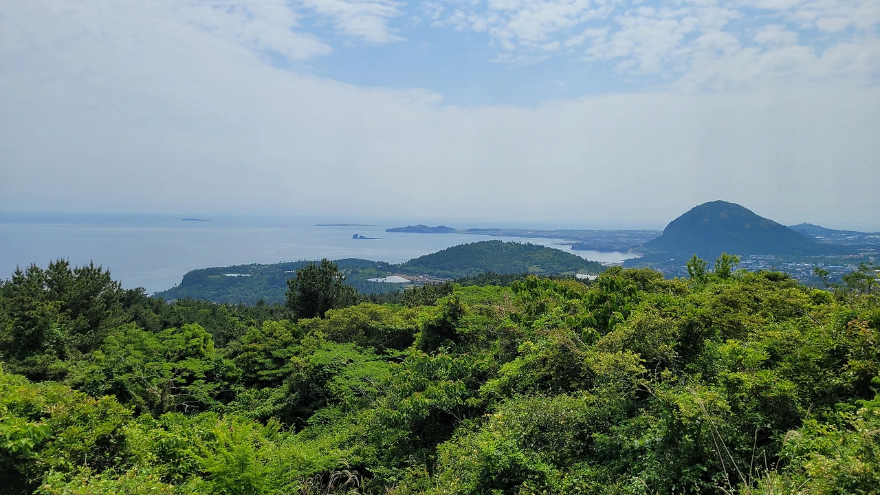멀리 범섬과 문섬, 섶섬이 서귀포 앞 바다에 떠 있고, 강정항과 새연교가 도들라져 보이다.