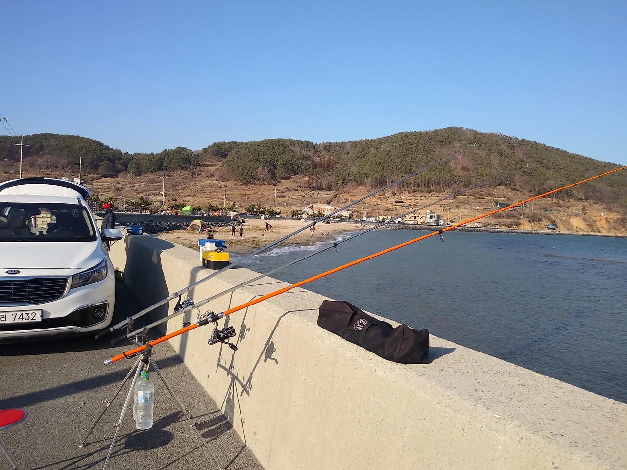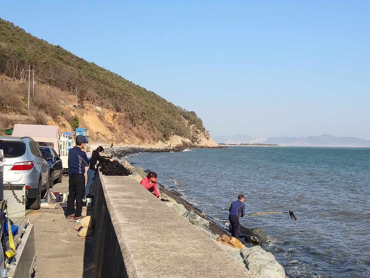 방조제 동쪽의 백사장과 넓은 테크 위에는 텐트를 쳐놓고 일광욕을 하는 사람들이 많이 보인다. 방조제 옆에 승용차가 일렬종대로 주차되어 있고 낚싯대도 열 지어 있다.